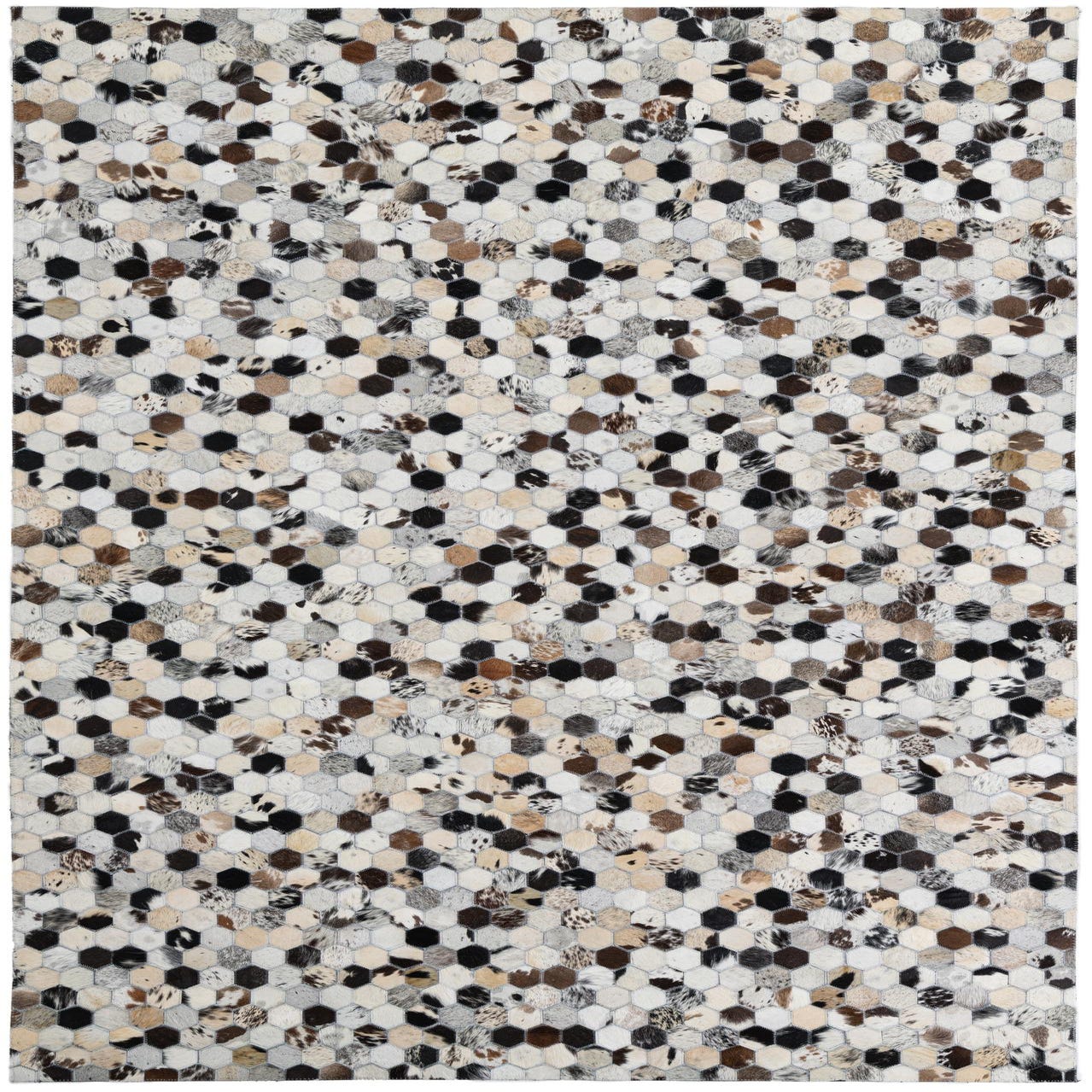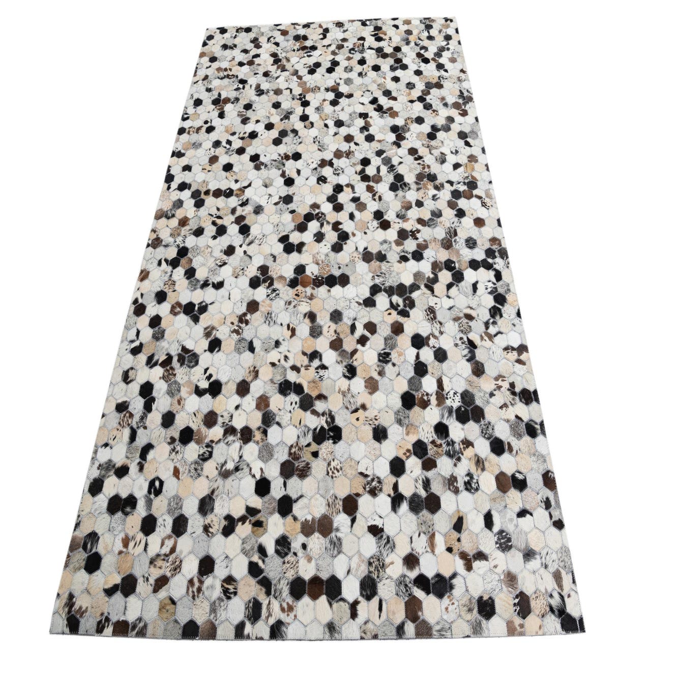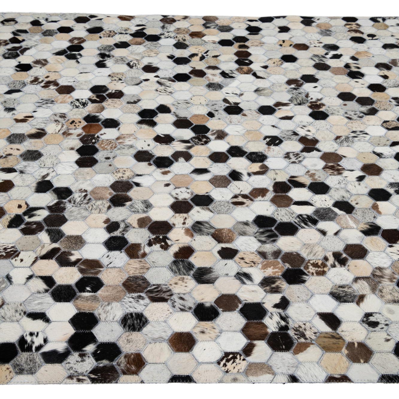 A 5x8 rectangular Cowhide Leather rug featuring a modern, abstract pattern of multi-colored hexagonal patches in shades of white, black, brown, and grey.