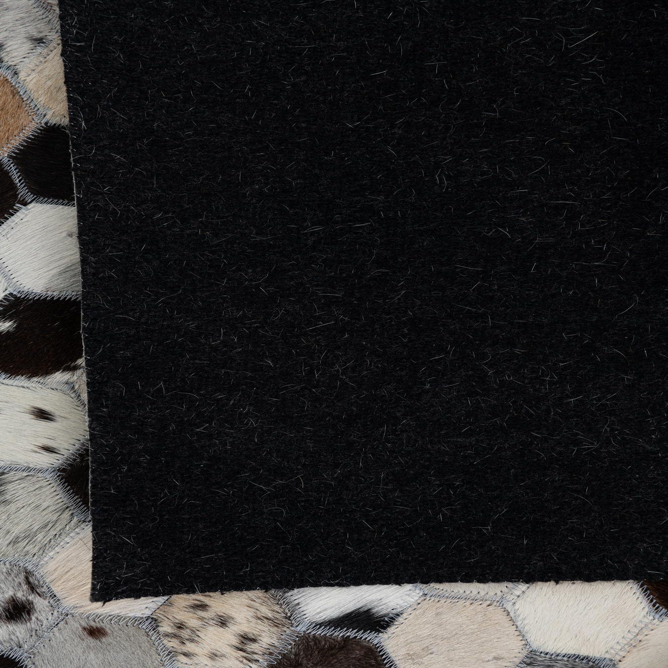 This Cowhide Leather 5x8 rug presents a dynamic patchwork pattern comprising hexagonal shapes. The composition utilizes natural shades of beige, black, brown, gray, tan, ivory, and a multi-colored background, creating a visually engaging surface. Each piece of cowhide and leather is thoughtfully pieced together, offering not only an intricate aesthetic but also varied textures that underfoot provide a distinctive tactile experience.