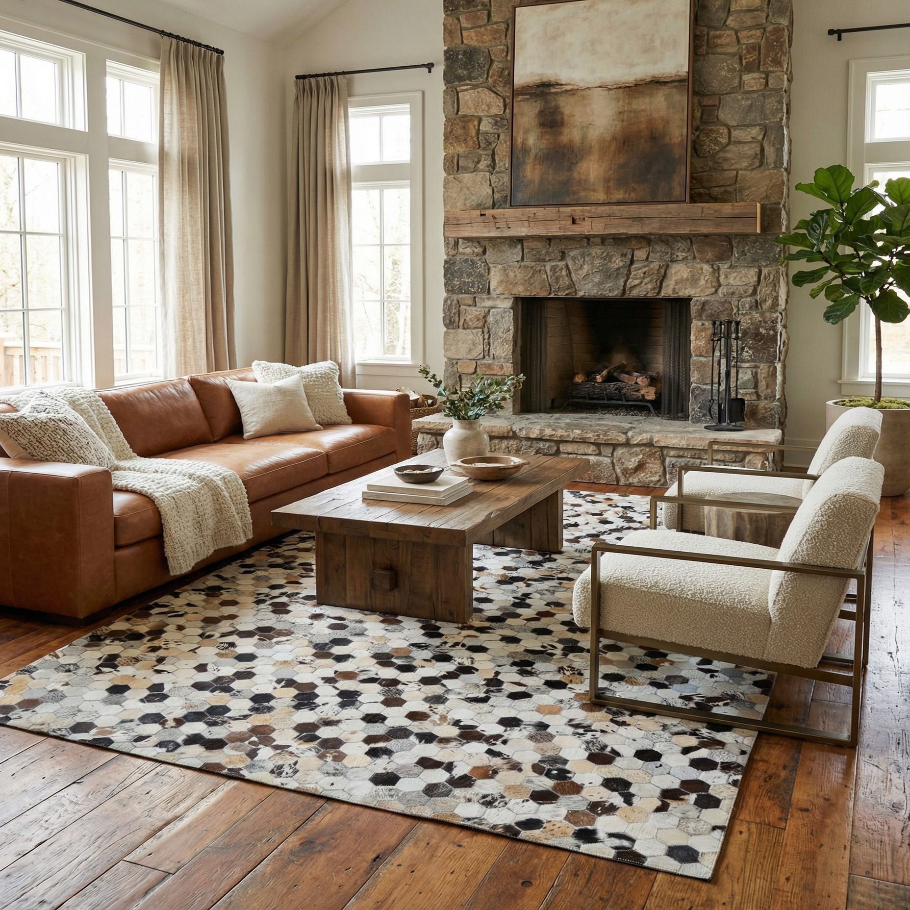 A 5x8 rectangular rug featuring a modern, abstract pattern of multi-colored hexagonal cowhide and leather patches.