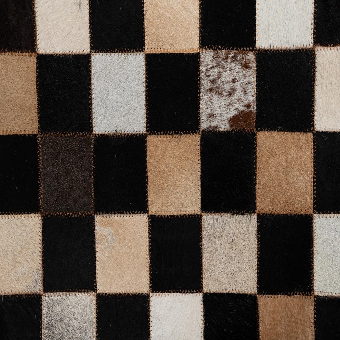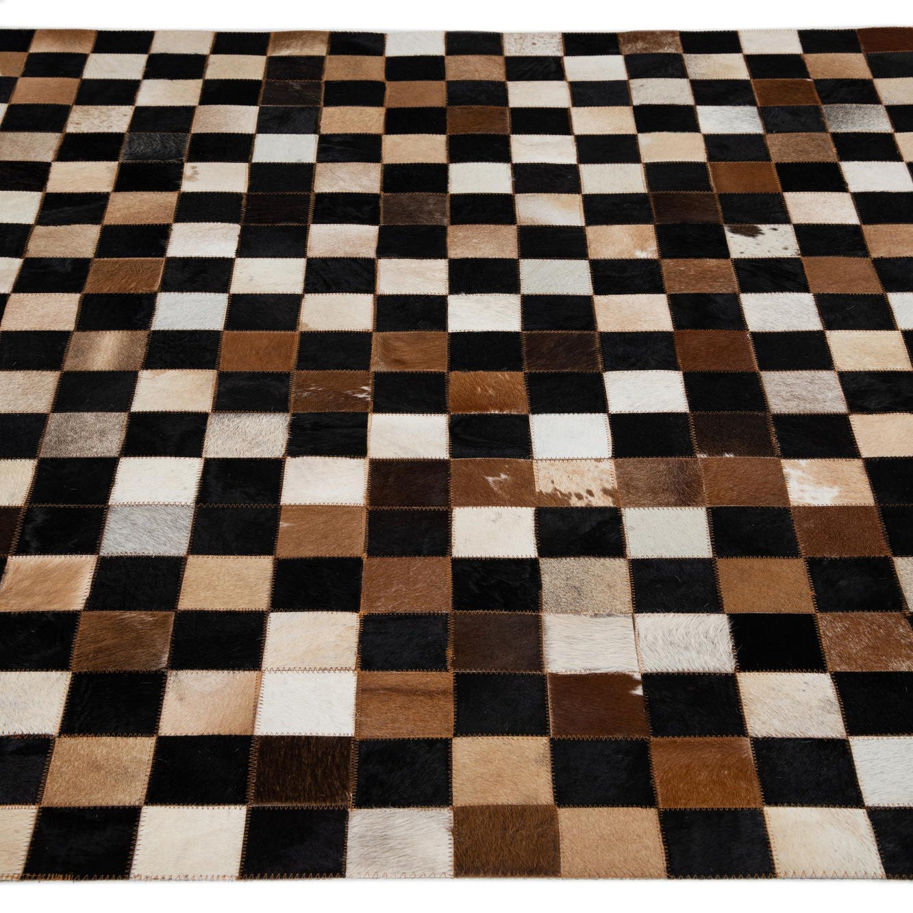 A 5x8 rectangular Cowhide Leather rug featuring a modern checkered pattern in black, white, and various shades of brown.