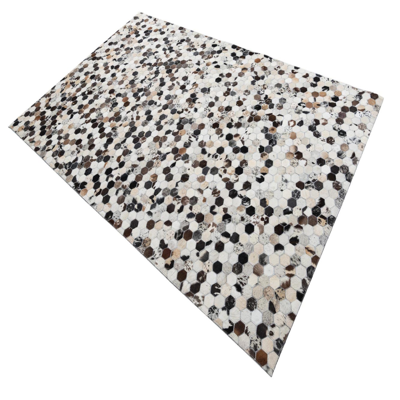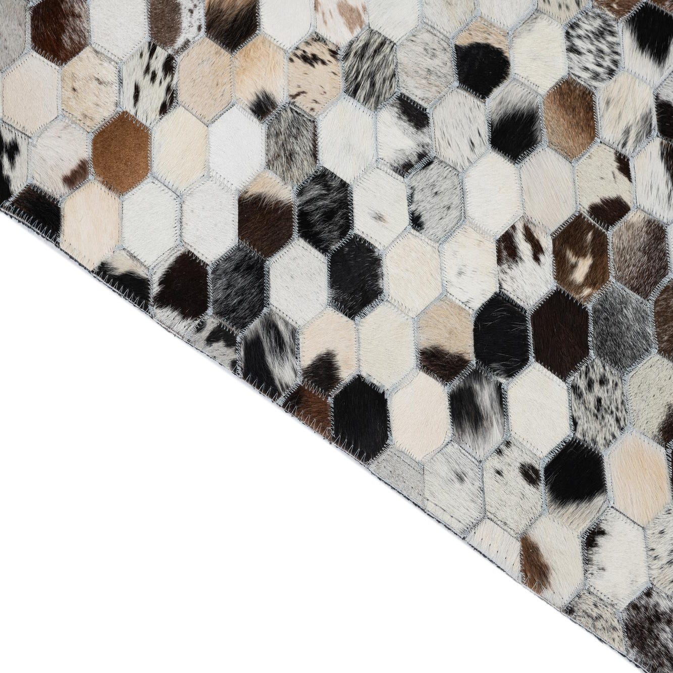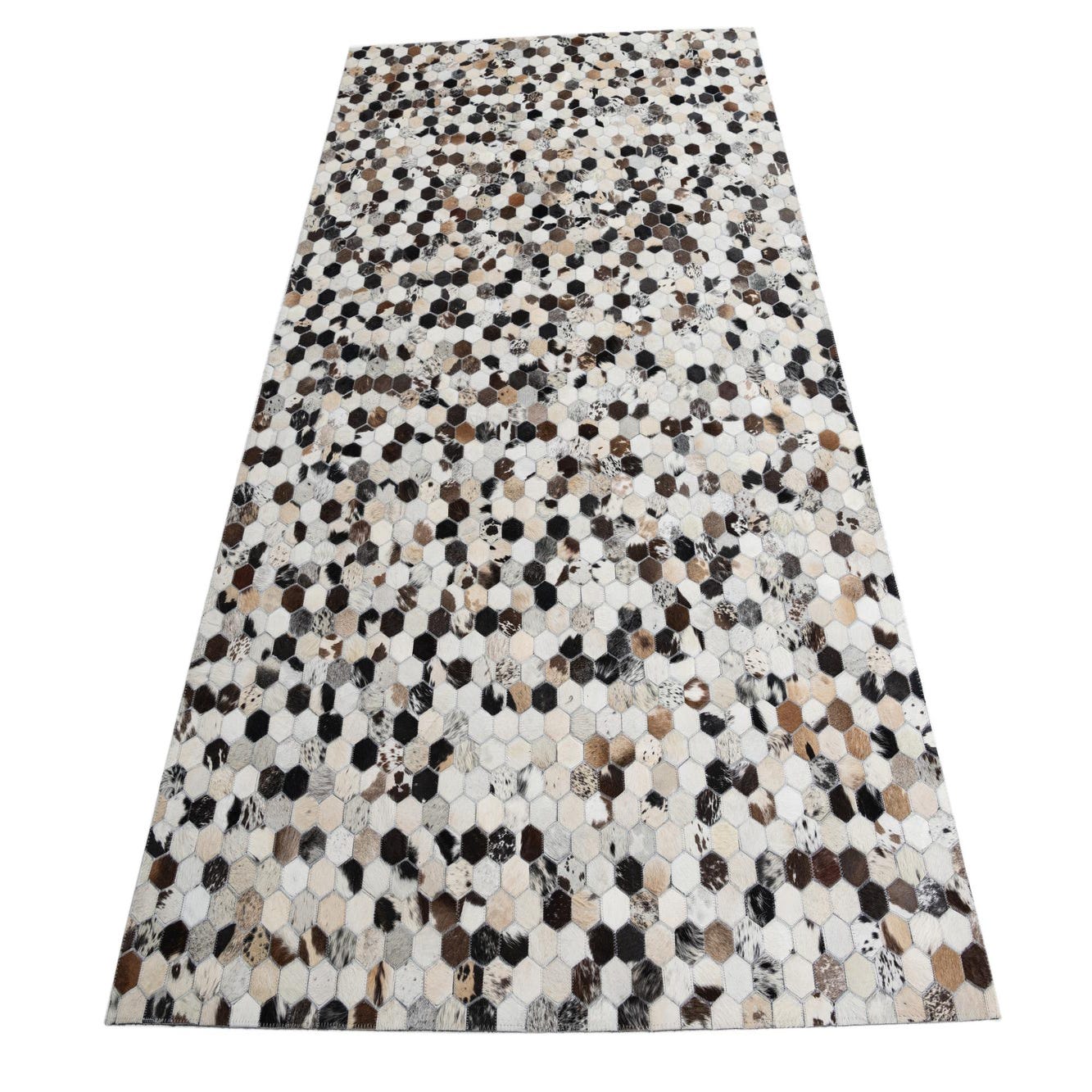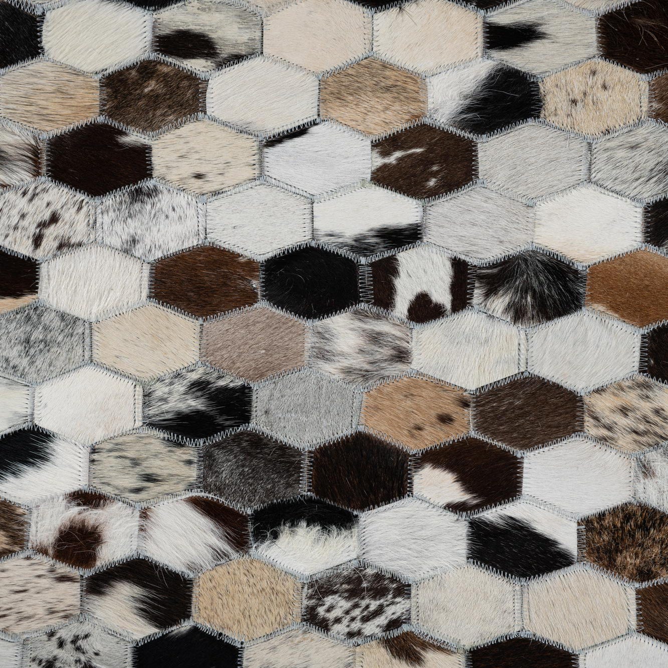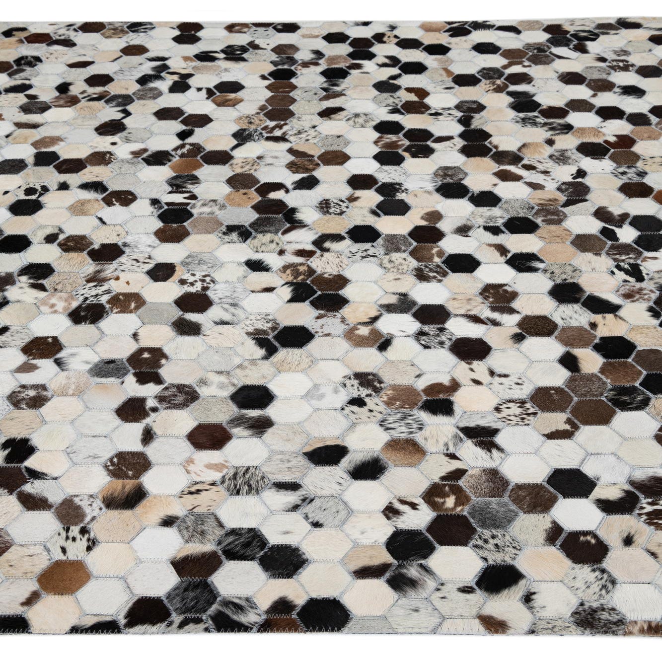 A 5x8 rectangular Cowhide Leather rug featuring a modern, abstract pattern of multi-colored hexagonal patches in varying shades of brown, black, and white.