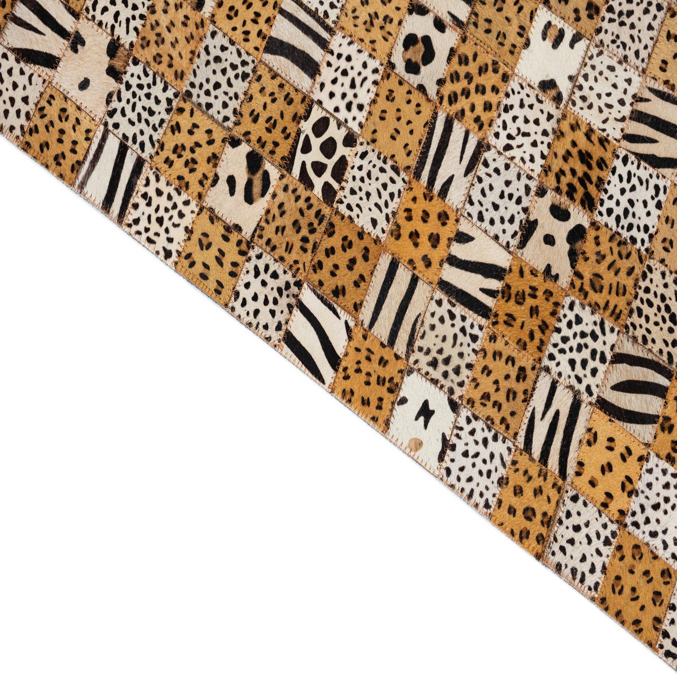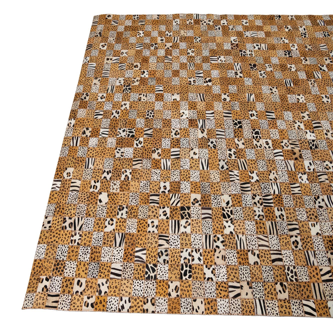 A 5x8 rectangular Cowhide Leather rug featuring a modern, multi-colored checkerboard pattern of leopard and zebra print squares.