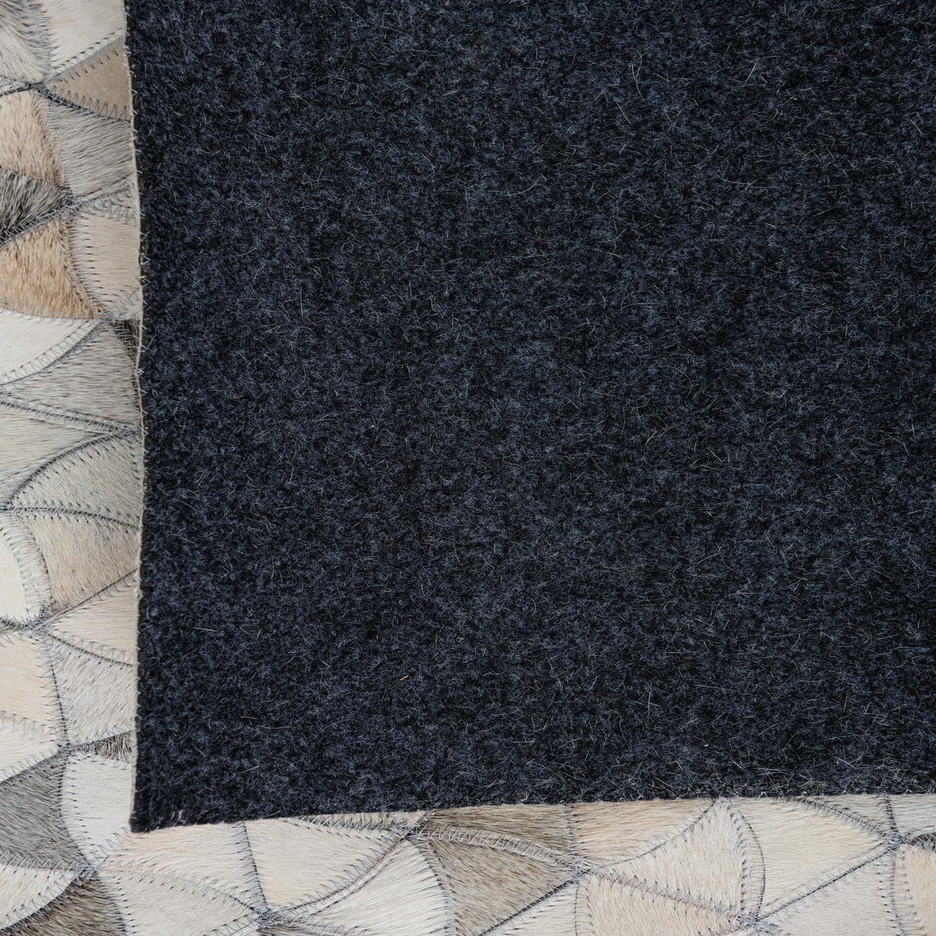 A 5x8 rectangular Cowhide Leather rug featuring a modern, abstract pattern of multi-colored triangular and scalloped shapes in shades of grey, beige, and white.