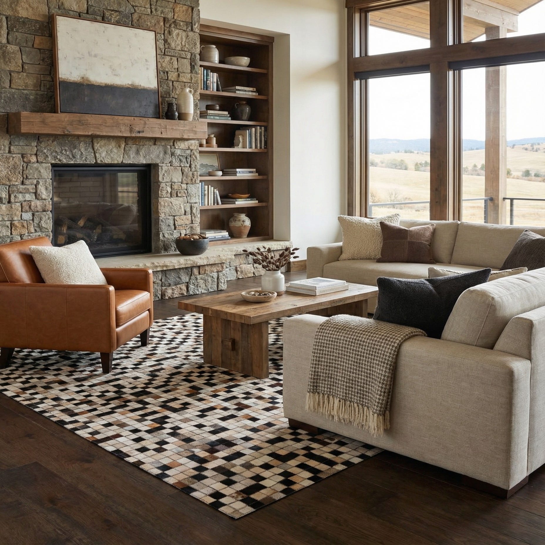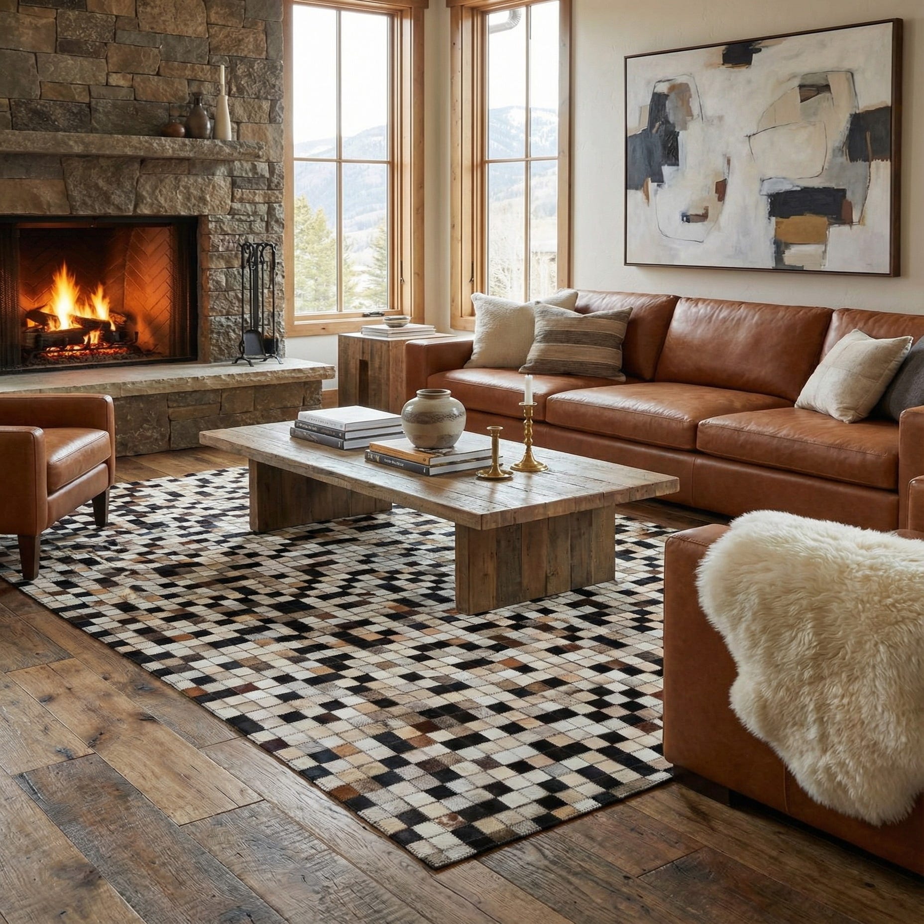 The Cowhide Leather collection presents a handcrafted 5x8 area rug, meticulously pieced together with squares of genuine cowhide in a checkerboard design. This rug showcases an earthy color palette including beige, black, brown, ivory, light brown, and tan, set against a multi-toned background. The natural variations in texture and color of the cowhide convey a unique and authentic look, ensuring that no two rugs are exactly alike.