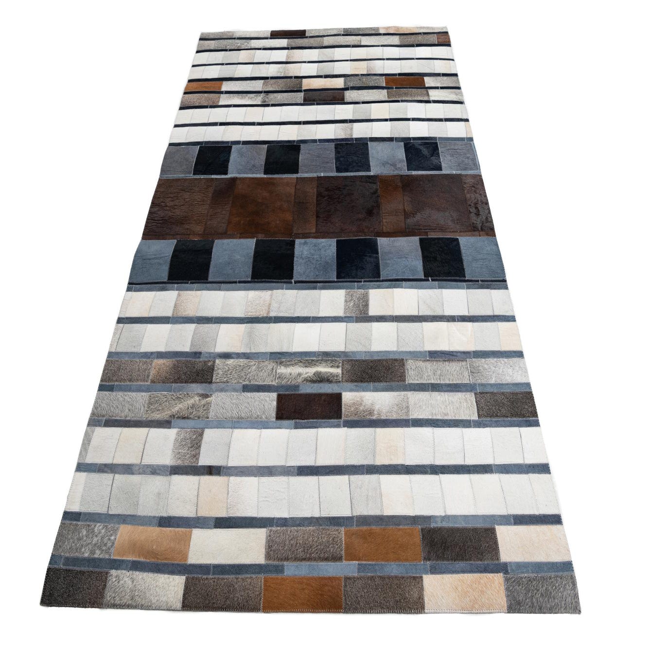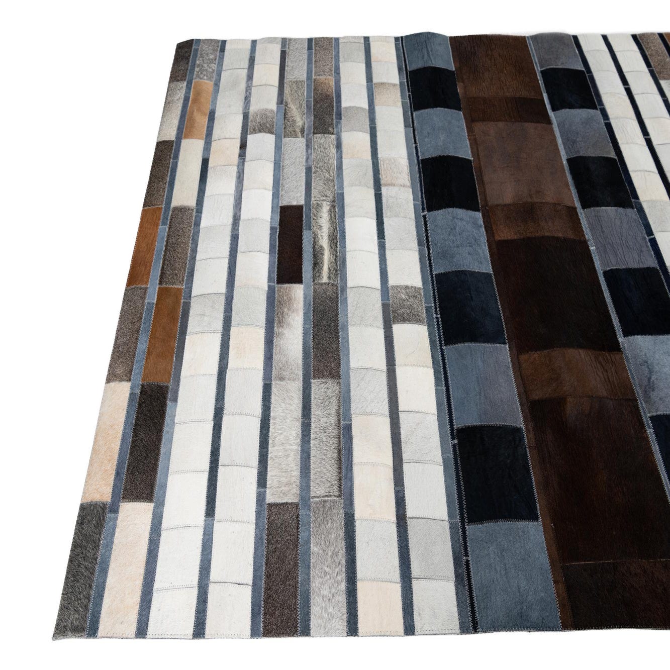 A 5x8 rectangular Cowhide Leather rug featuring a modern, abstract patchwork design in multi-colored shades of brown, black, grey, and white.