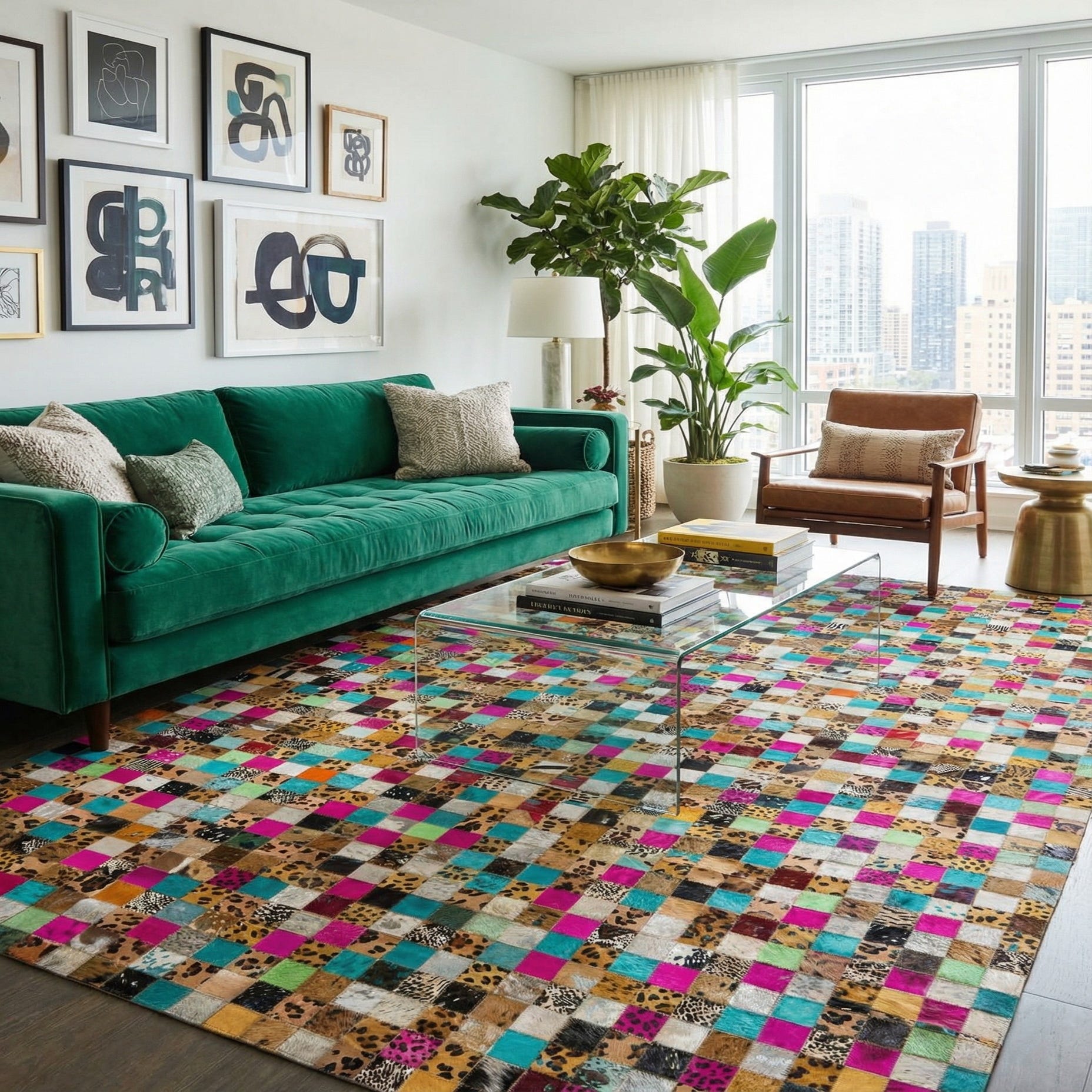 A 5x8 rectangular Cowhide & Leather rug featuring a modern, abstract patchwork of multi-colored squares, including animal prints and solid bright pink, turquoise, and various earth tones.