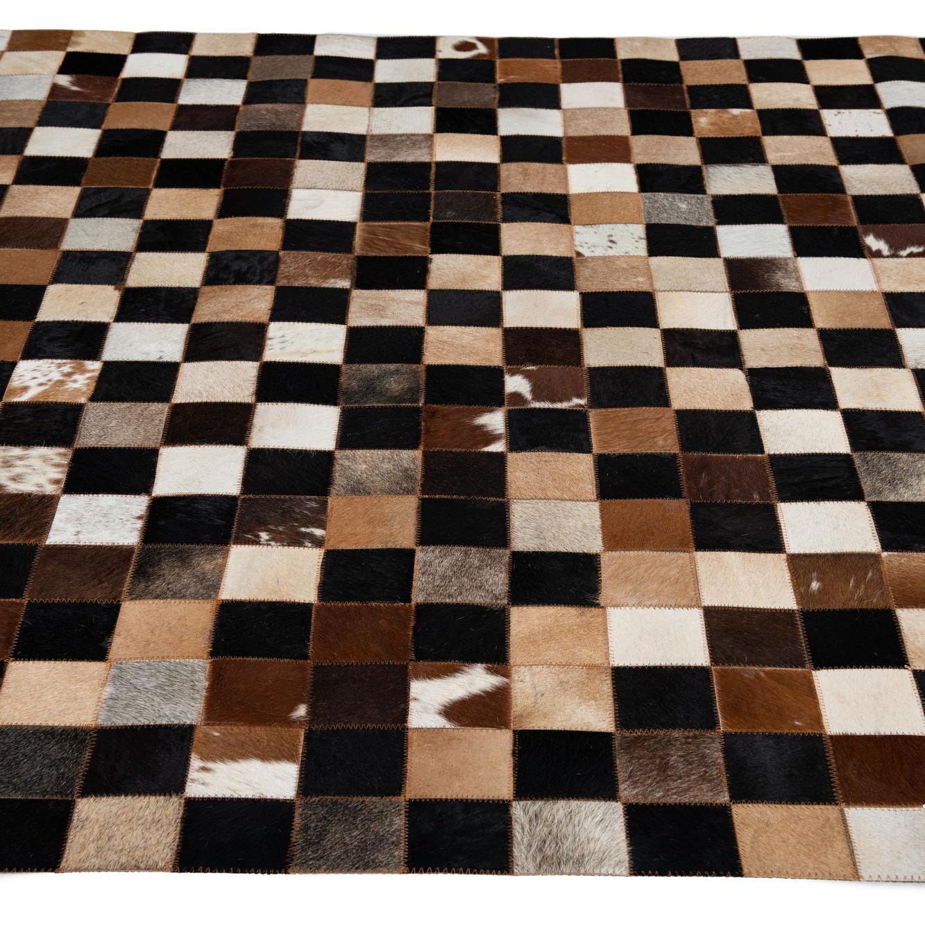 A 5x8 rectangular cowhide rug featuring a modern checkerboard pattern in black, white, and various brown tones.