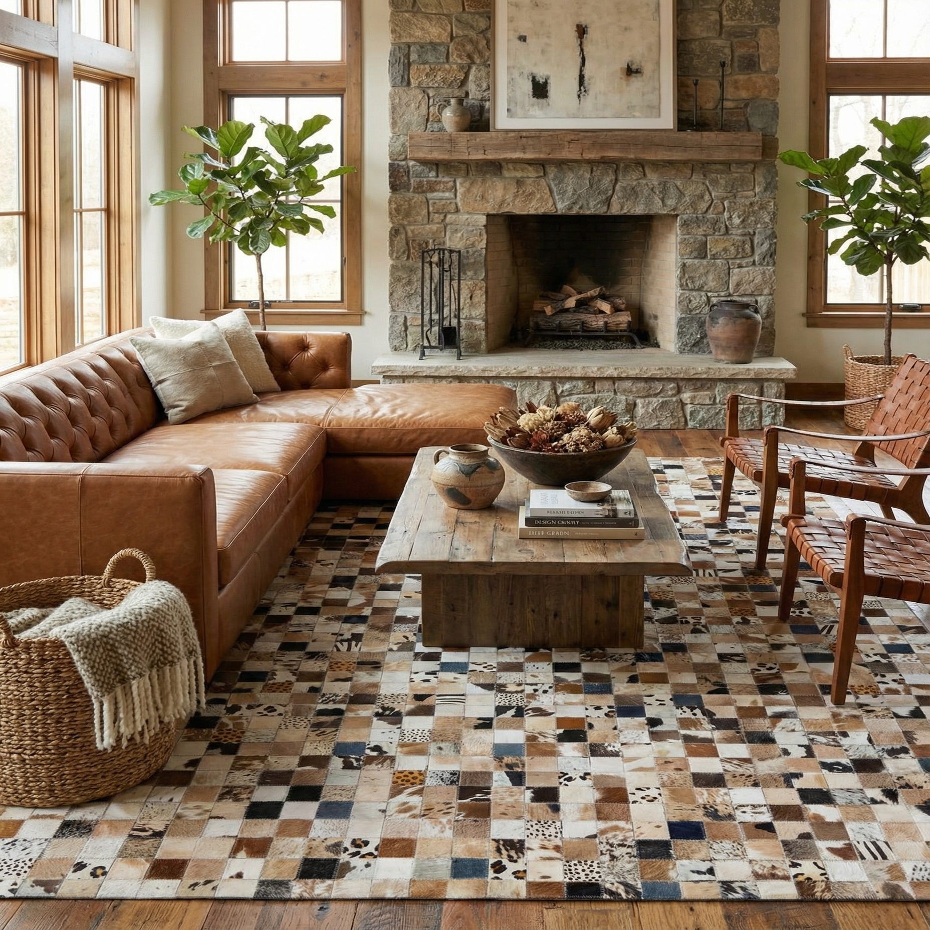 This rug would complement modern, rustic, and industrial interiors, serving as a statement piece that can anchor a living room, den, or office space. It would pair well with minimalist furniture to allow its complex pattern to stand out, or with rich leather and wood tones that echo its natural elements. The Cowhide Leather rug is designed to integrate into a multitude of styles, providing both durability and a distinctive aesthetic to any room.
