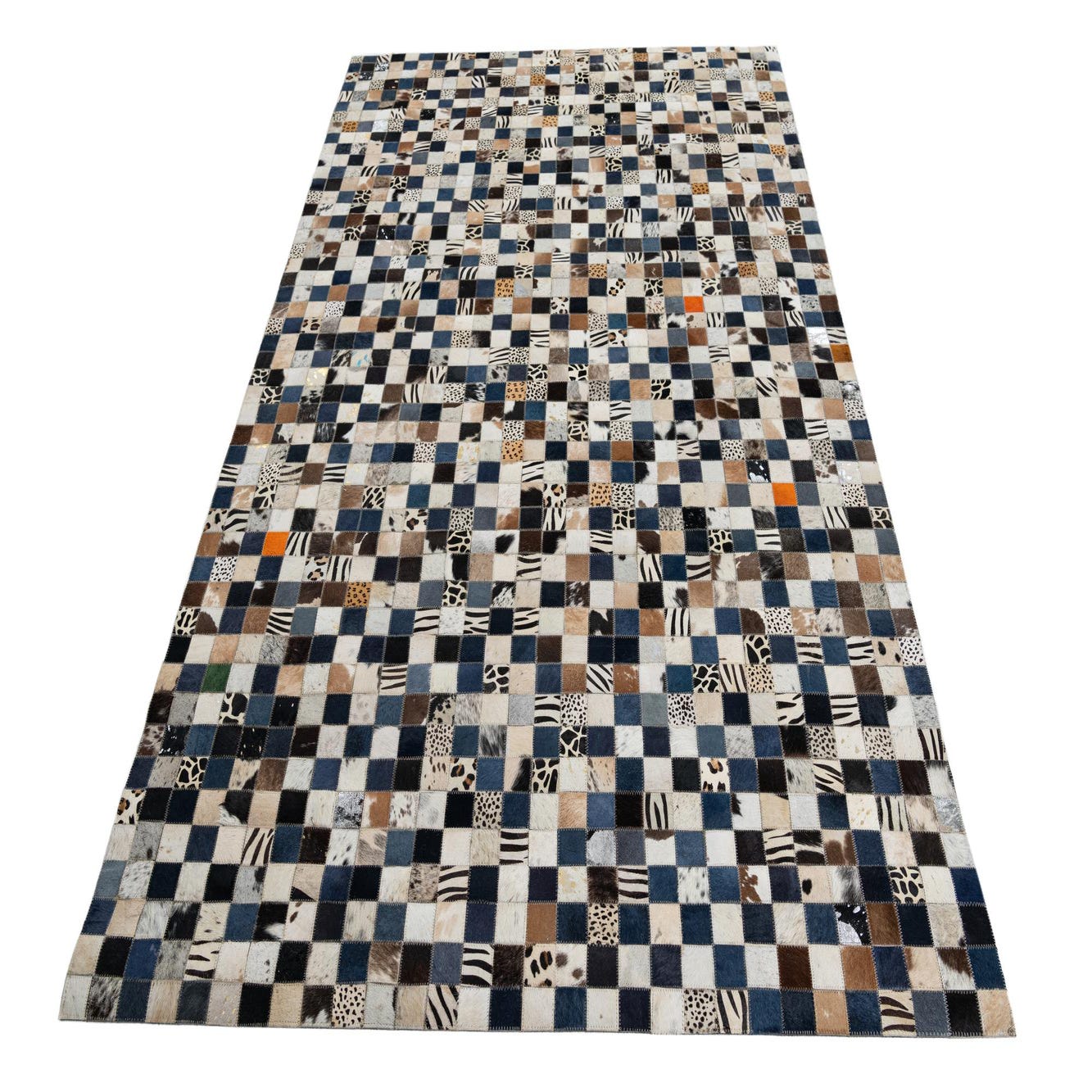 A 5x8 rectangular Cowhide Leather rug featuring a modern, abstract patchwork design in multi-colored squares, including animal prints and denim blue.