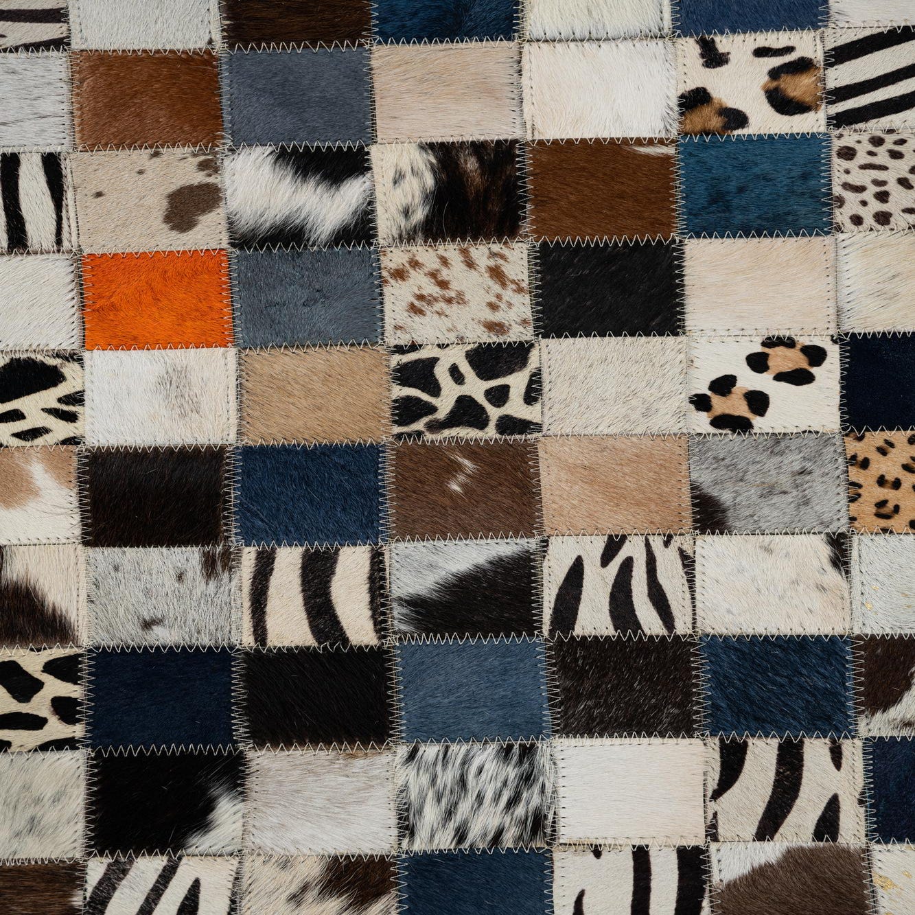 Each square showcases unique variations inherent to cowhide, including diverse textures and patterns that range from solid colors to animal prints. The durable cowhide and leather materials promise longevity, making this rug an ideal choice for areas with moderate foot traffic.