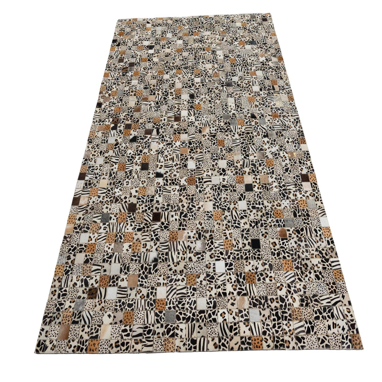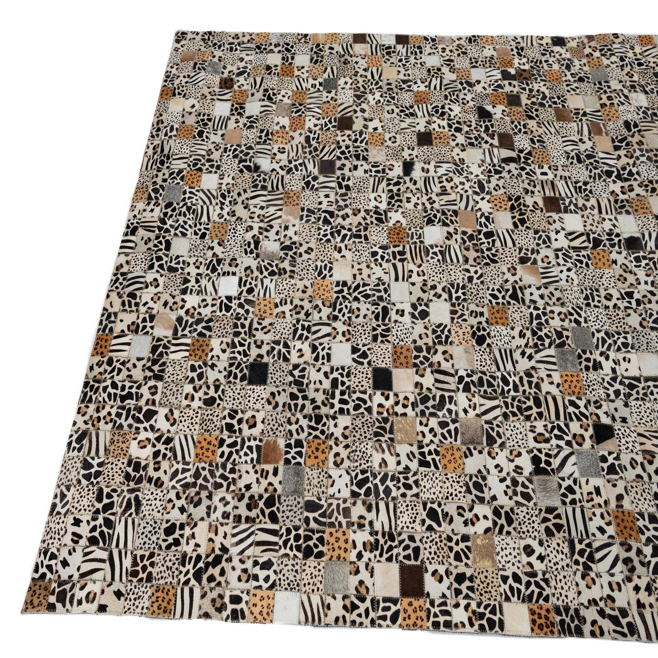 A 5x8 rectangular Cowhide Leather rug featuring a modern patchwork of multi-colored animal prints like leopard, zebra, and giraffe.