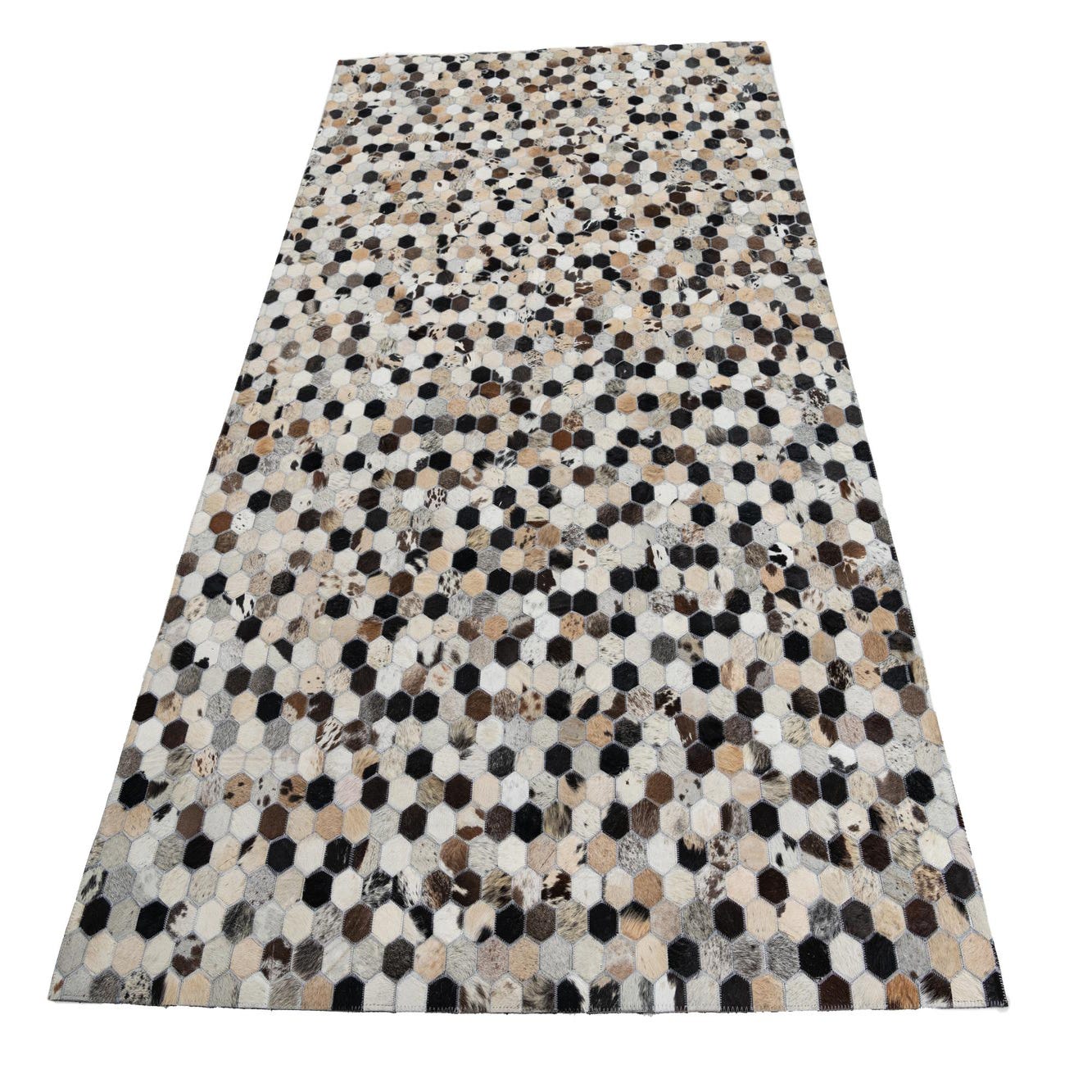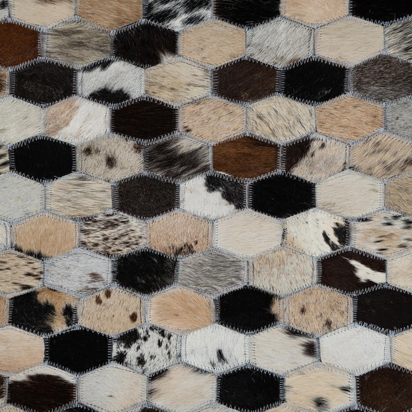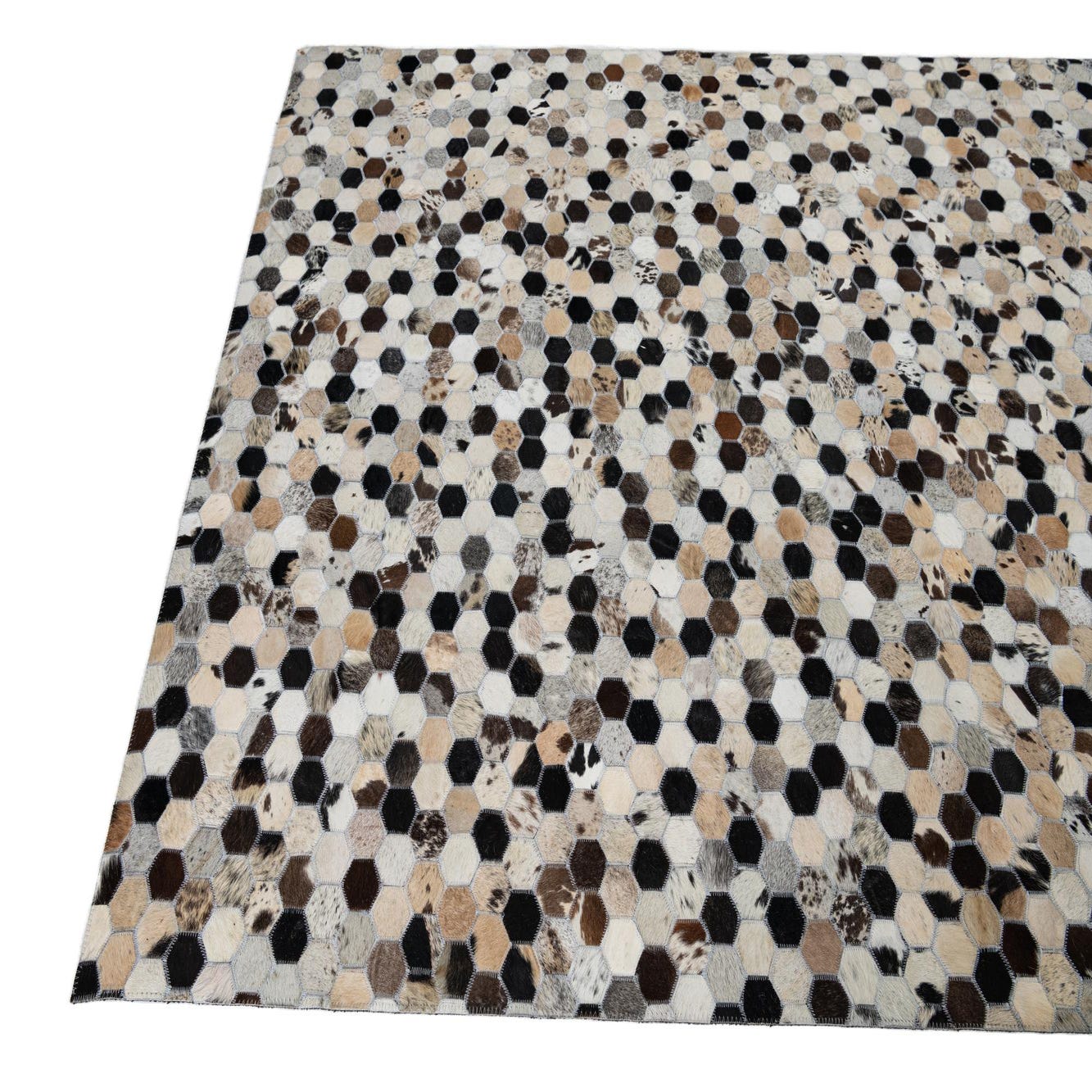 Part of our Cowhide Leather Collection, this 5x8 handcrafted rug is a unique statement piece that brings understated luxury to any space. The rug features an intricate pattern of hexagon-shaped pieces meticulously joined together to create a stunning mosaic of natural hues. Colors in this rug include beige, black, brown, ivory, gray, and multi-tones that form a rich, neutral color palette suitable for a variety of interior designs.