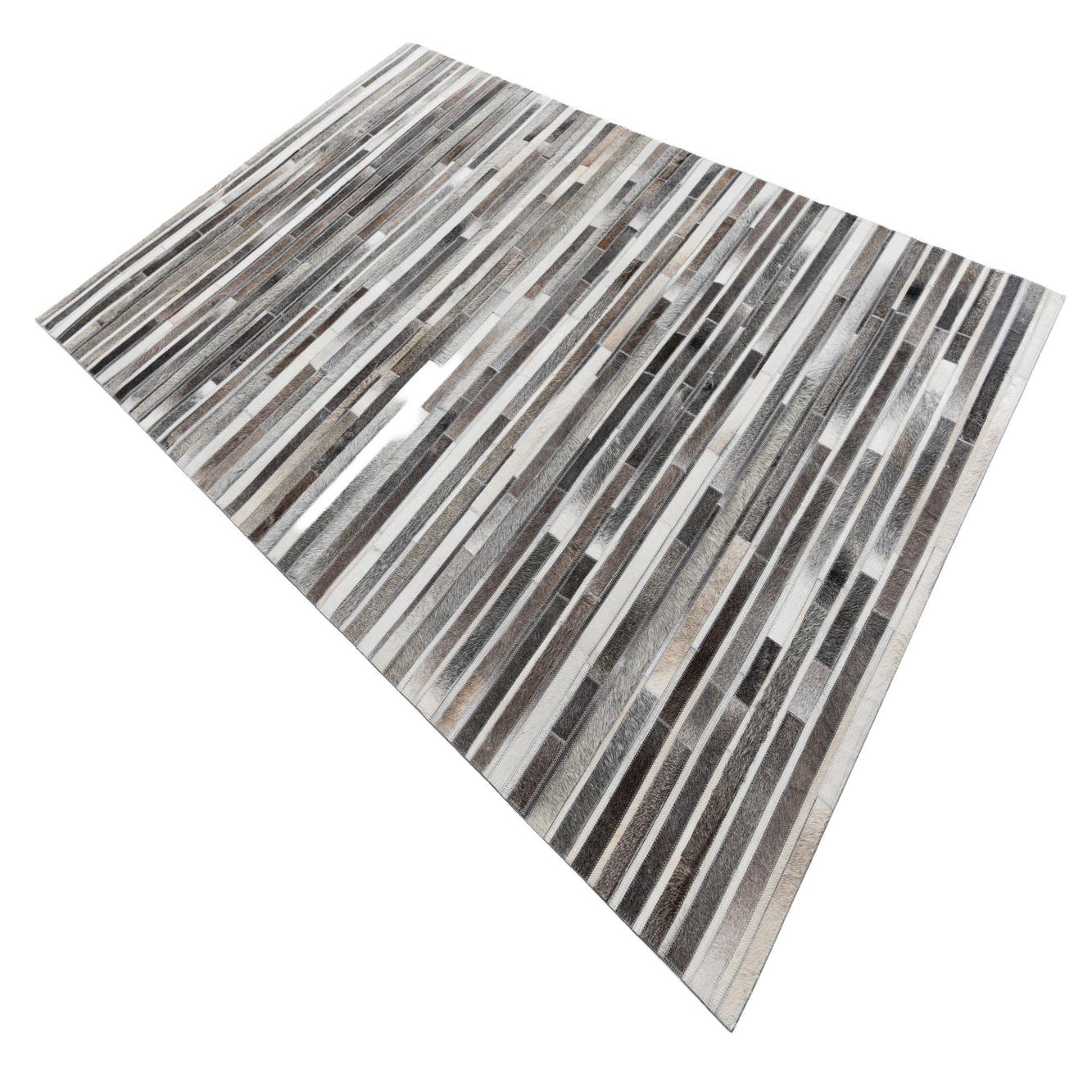 A rectangular 5x8 Cowhide Leather rug featuring a modern stripe pattern in multi-colored natural tones.