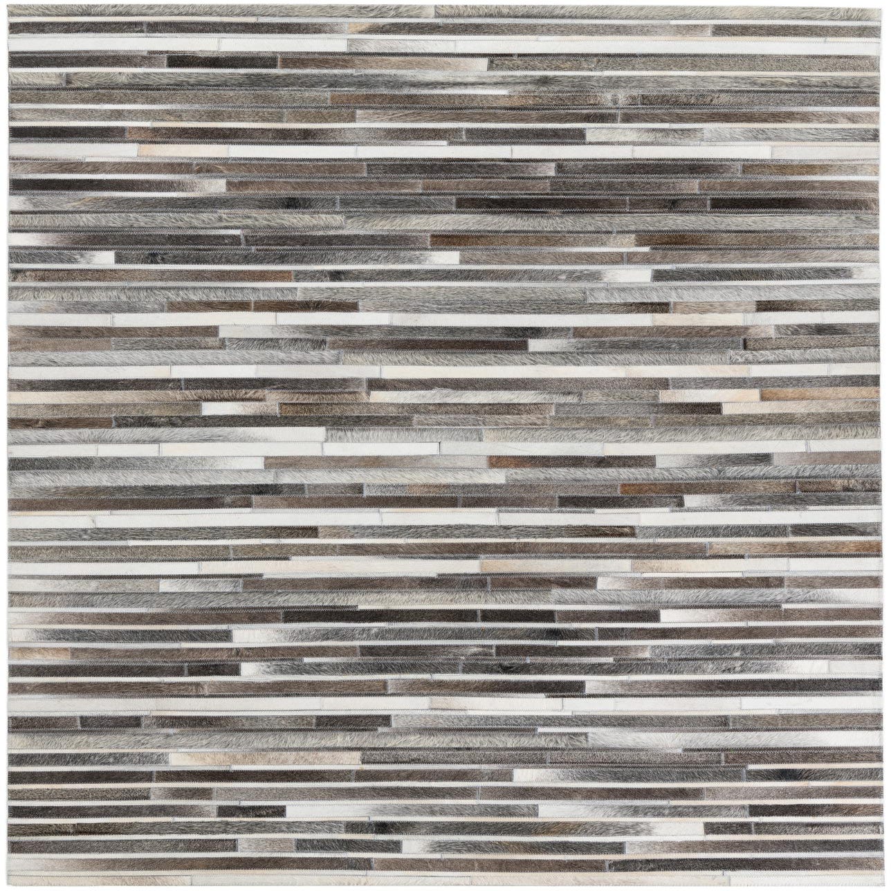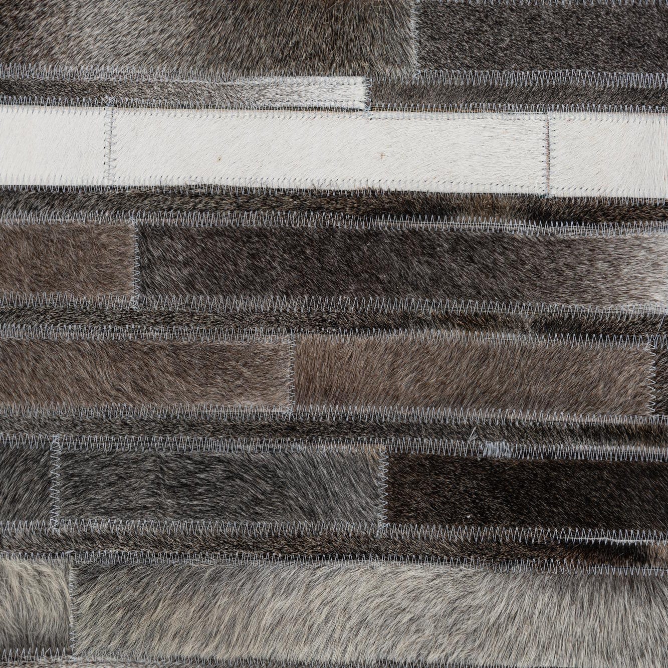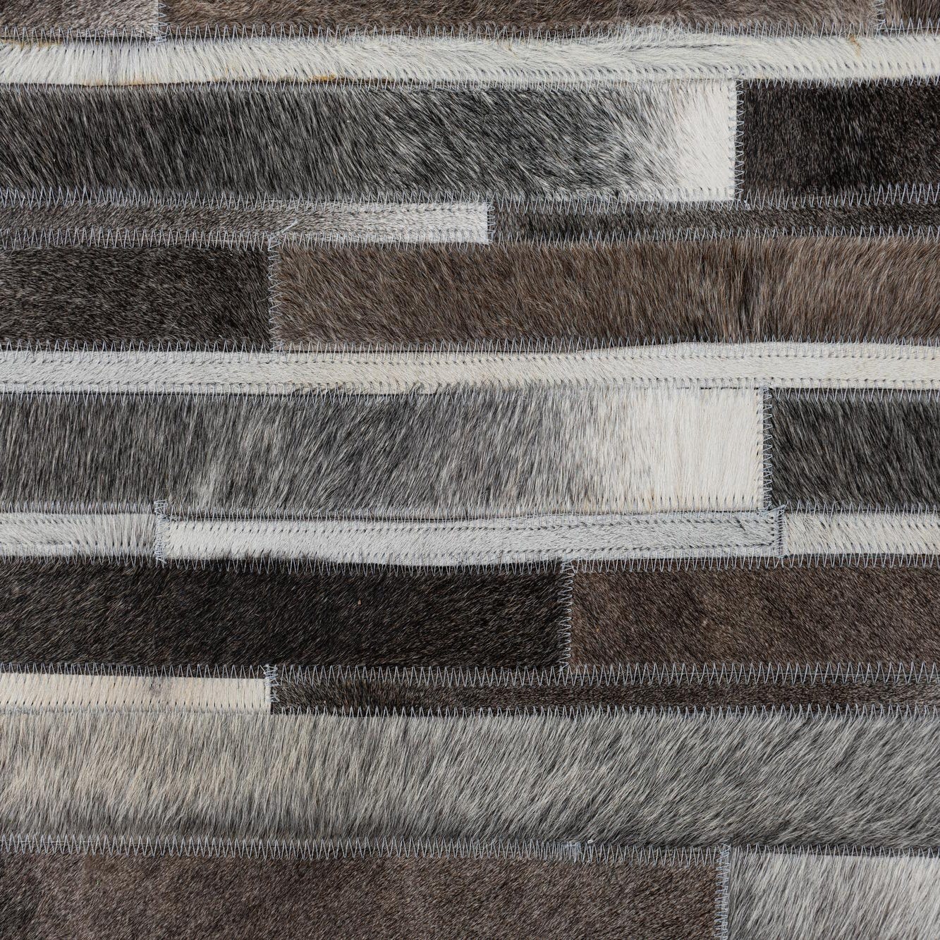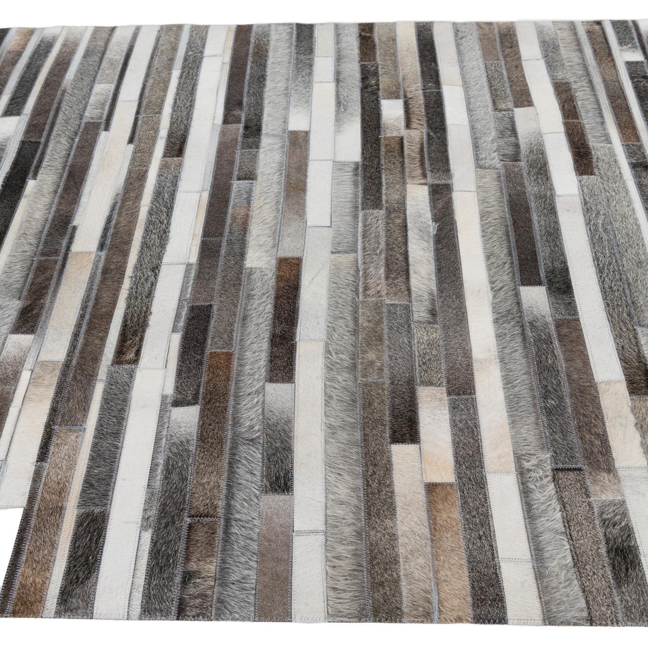 Handmade from cowhide and leather, this rug is constructed from narrow, rectangular strips stitched together in a linear patchwork. The horizontal banding creates a subtle striped pattern with staggered lengths that add visual movement across the surface. The multi background blends beige, black, brown, ivory, and gray in varying tones, while the hair-on-hide finish gives a soft, slightly nappered texture and a natural, low sheen. Visible seams and the directional grain of the hide lend a tactile quality that invites touch.