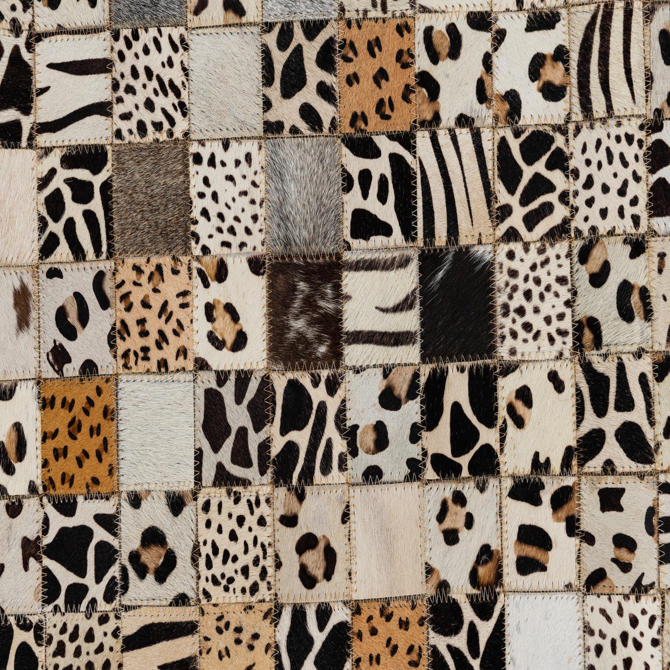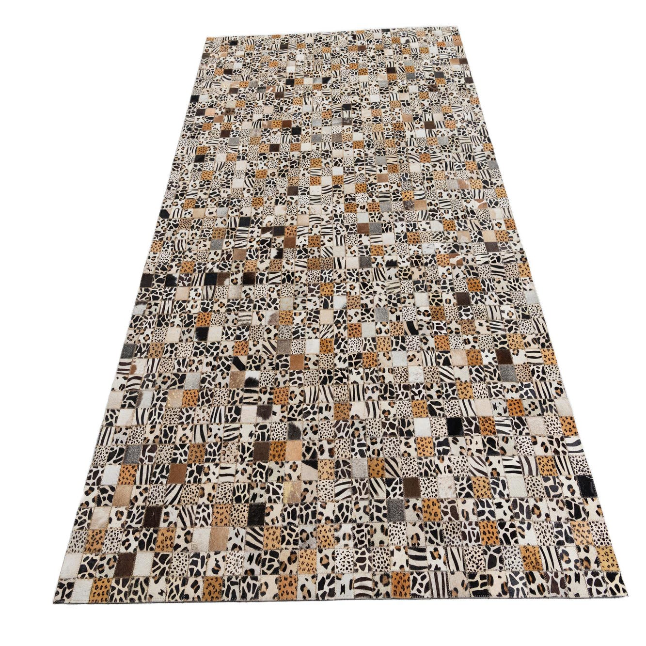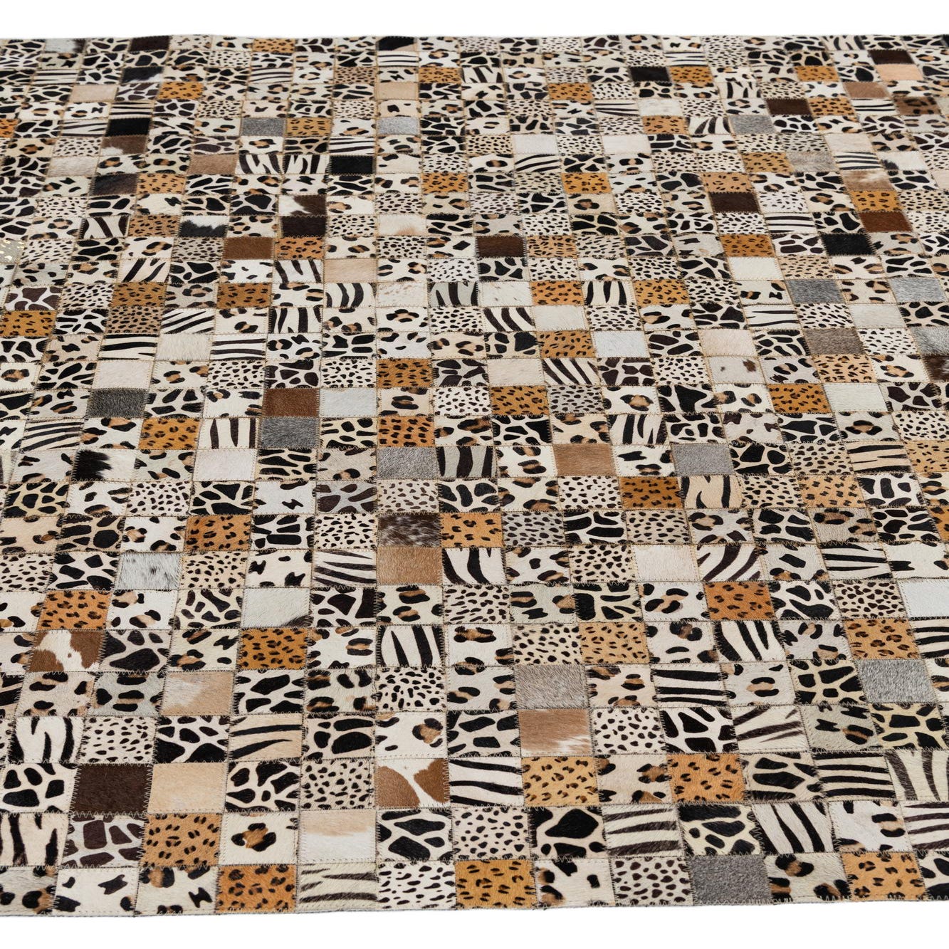 A rectangular 5x8 multi-colored modern rug featuring a patchwork of cowhide and leather squares with various animal prints.