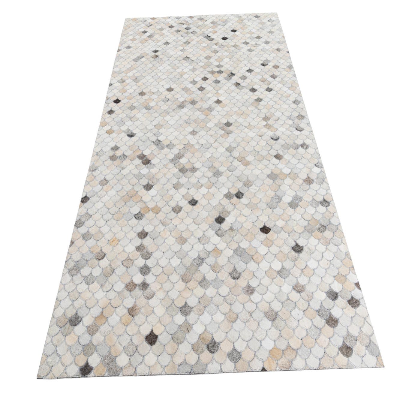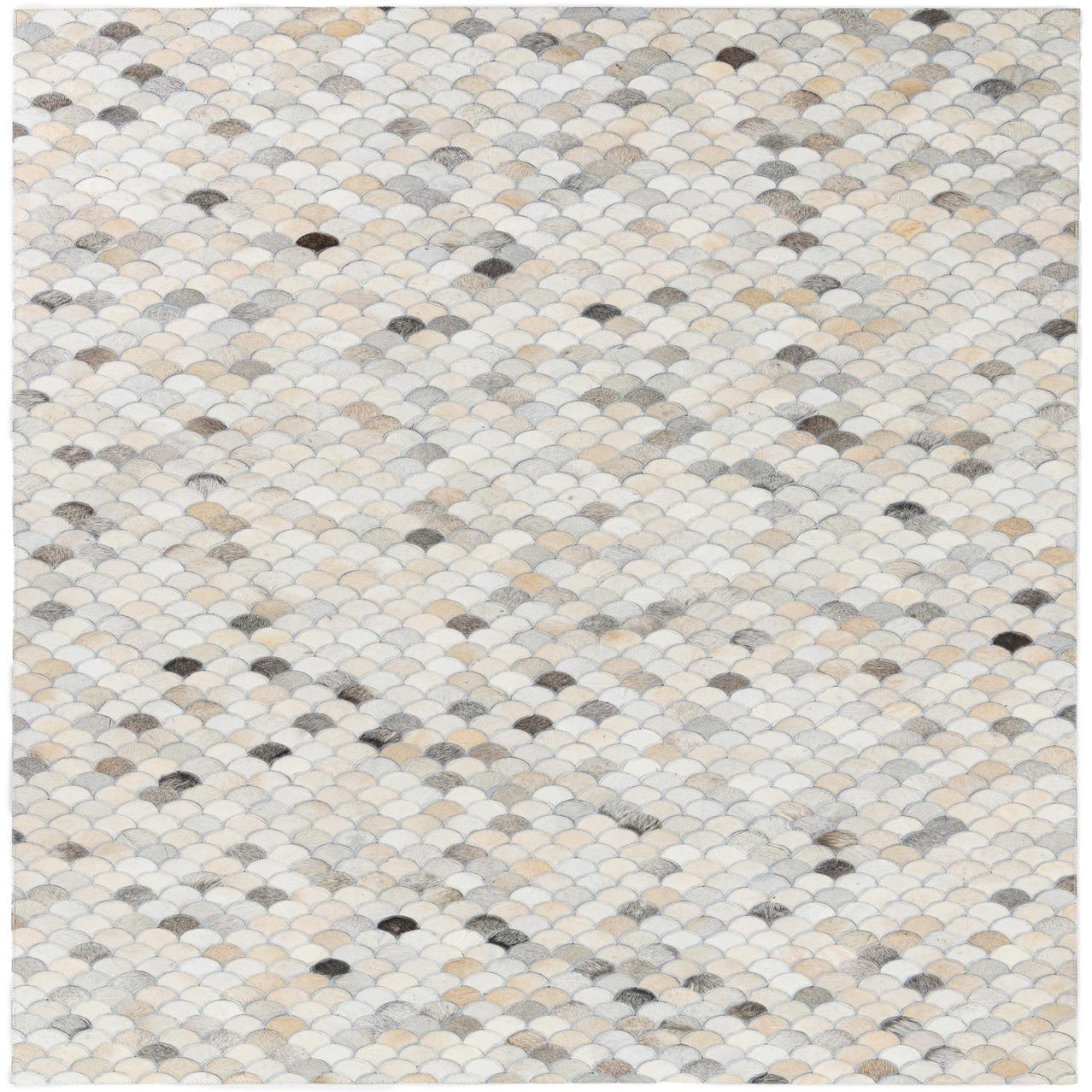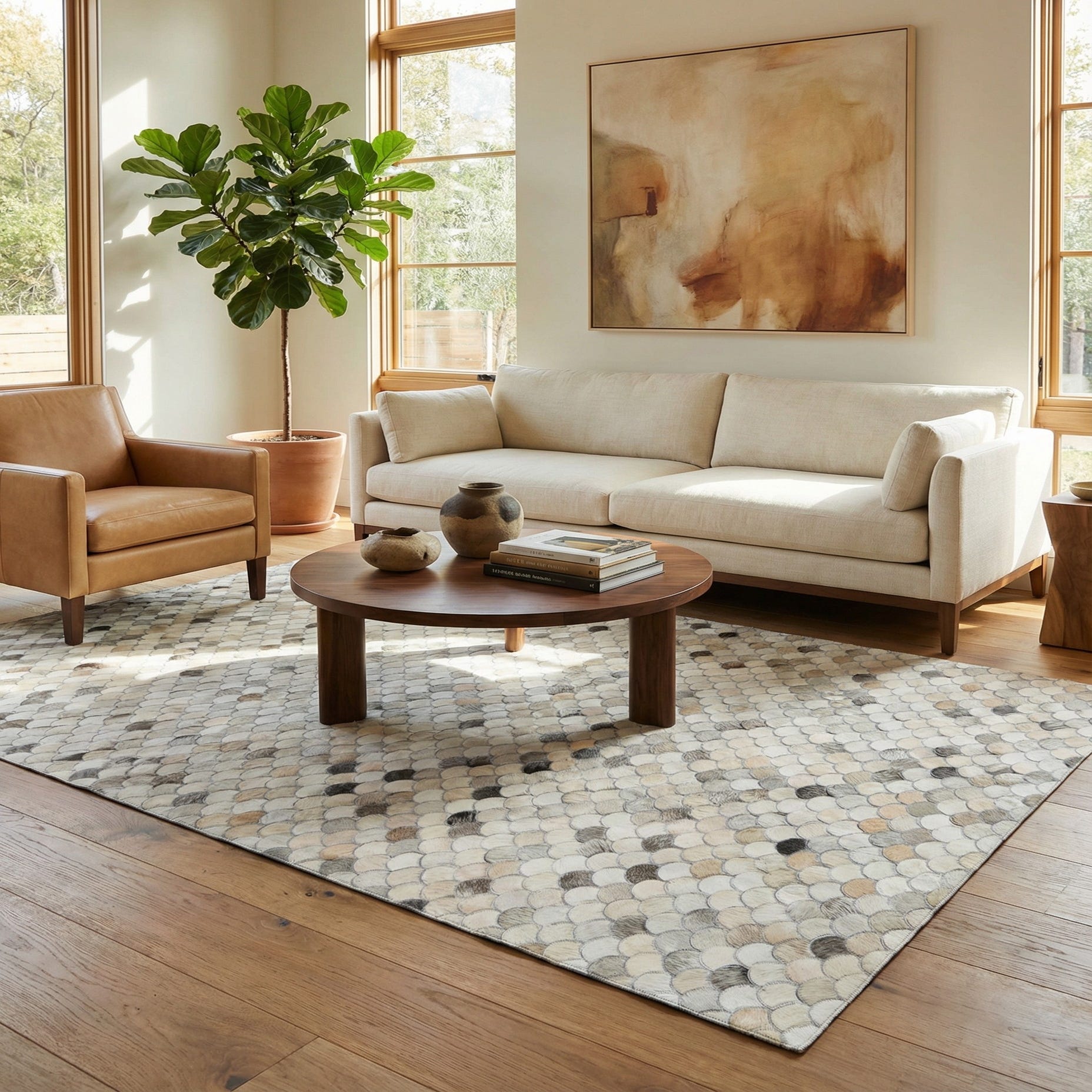 A rectangular 5x8 modern rug made from cowhide and leather, featuring a multi-colored scallop pattern in shades of white, beige, and gray, ideal for a living room.