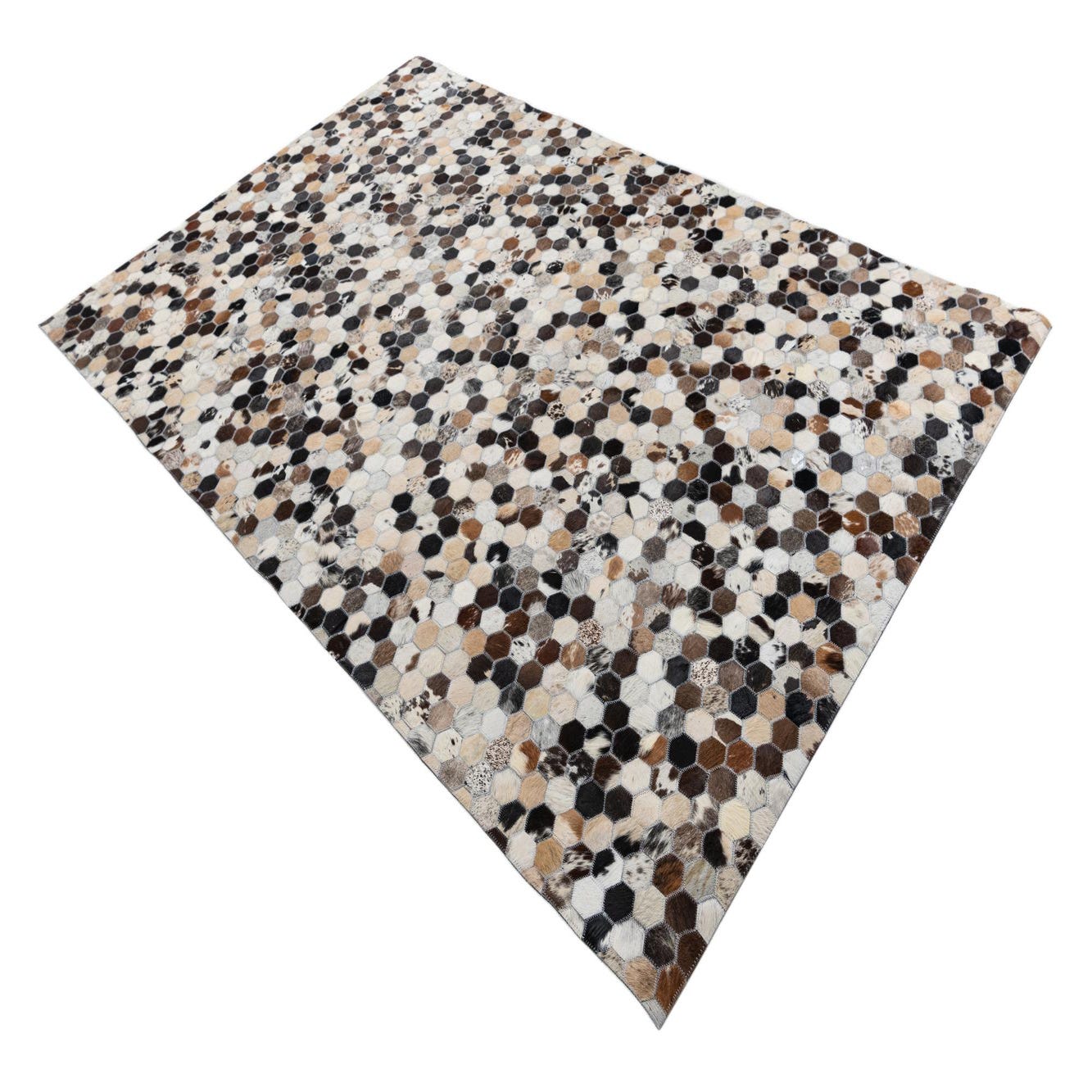 A 5x8 rectangular Cowhide Leather rug featuring a modern hexagonal patchwork pattern in multi-colored natural cowhide tones.