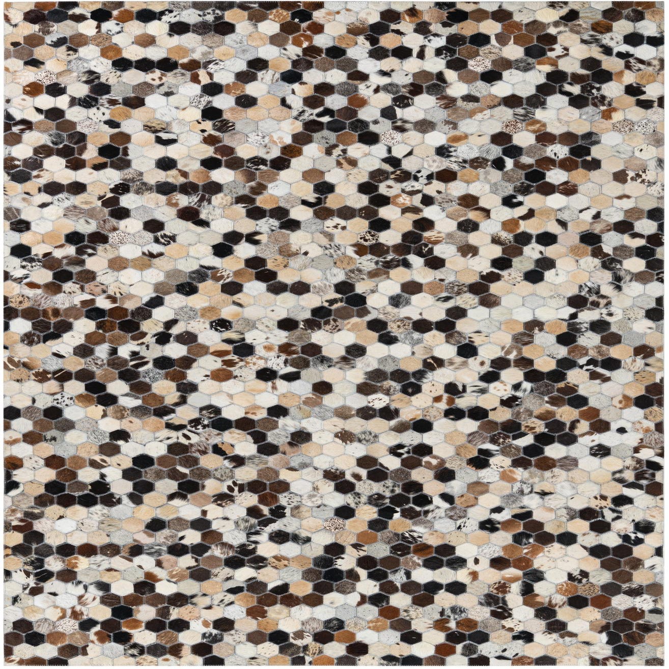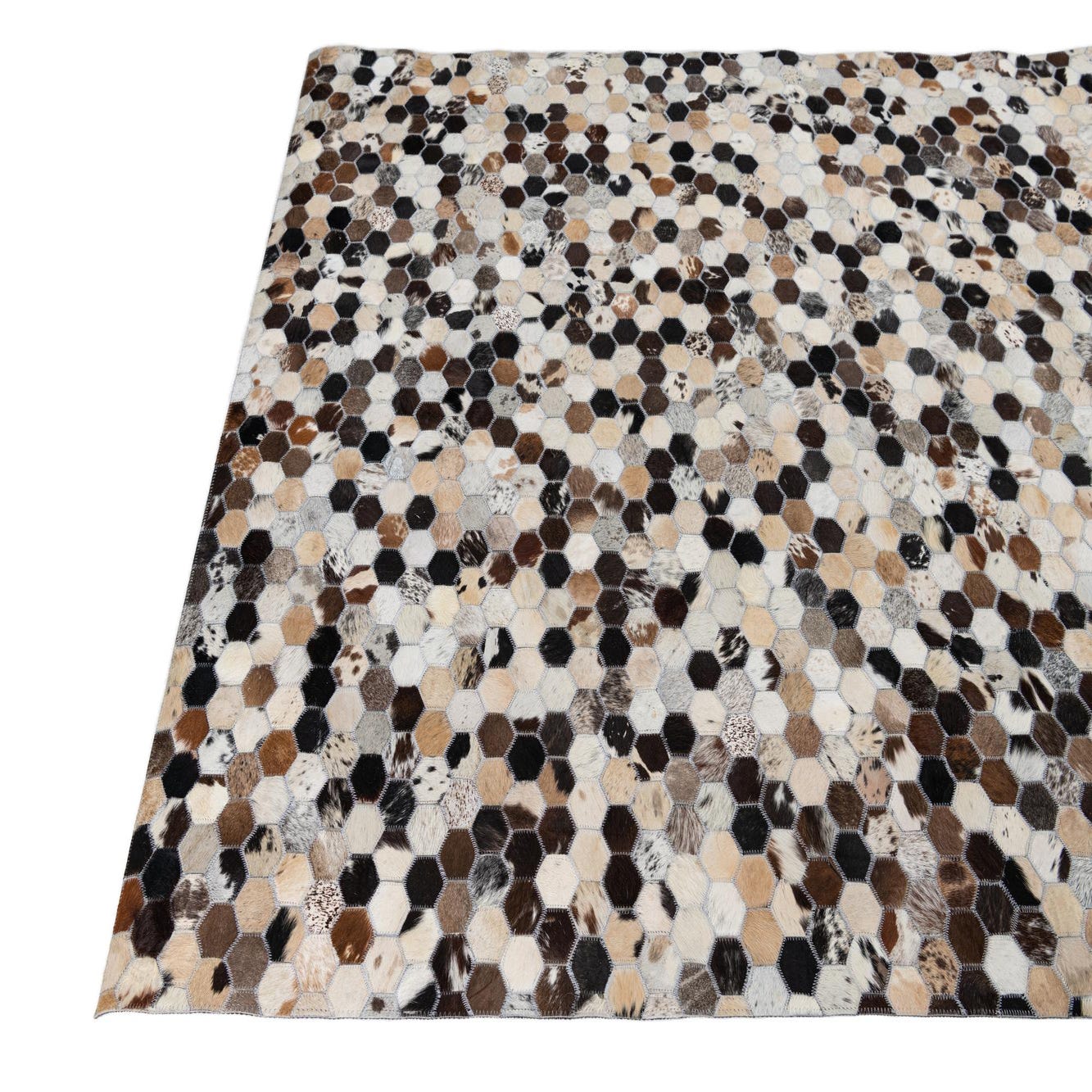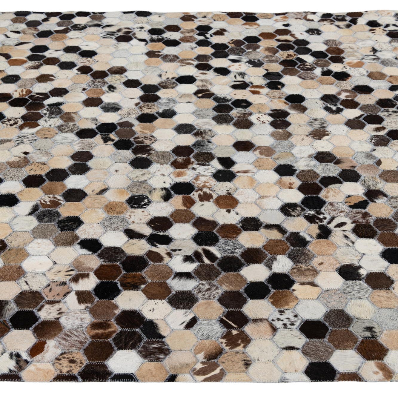 A tightly tiled hexagon pattern forms a honeycomb field of hand-cut cowhide patches, each piece stitched together to create a geometric yet organic surface. The multi background blends beige, ivory, light brown, brown, black and gray in a mix of solid tones and naturally speckled hides, giving the design depth and visual movement. The hair-on-hide texture is soft to the touch with subtle variations in nap and sheen that catch the light differently across the rug, while the leather backing and hand-stitched construction read as artisanal and tactile.