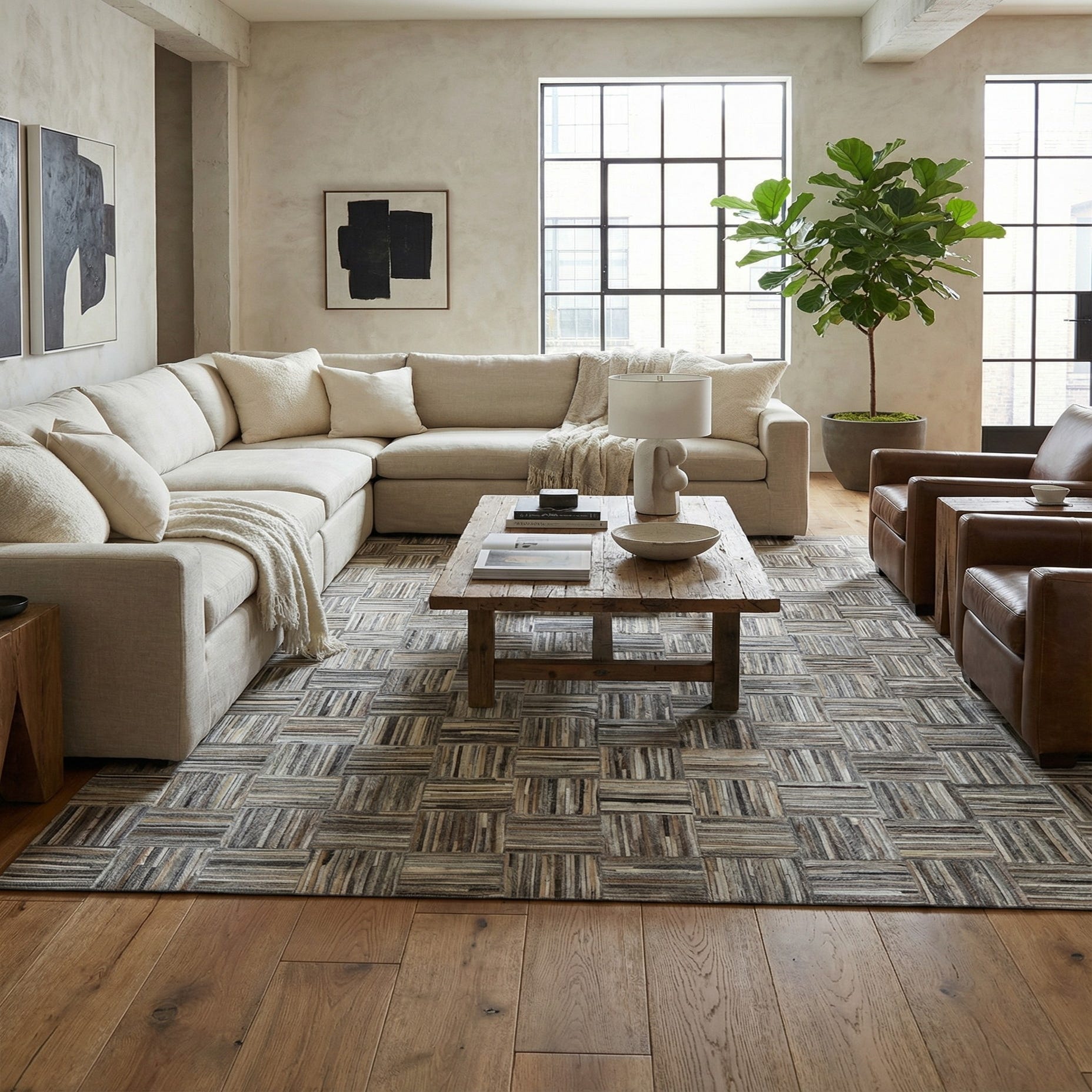 A 5x8 rectangular Cowhide Leather rug featuring a modern, multi-colored striped patchwork design in varying shades of brown, beige, and gray.