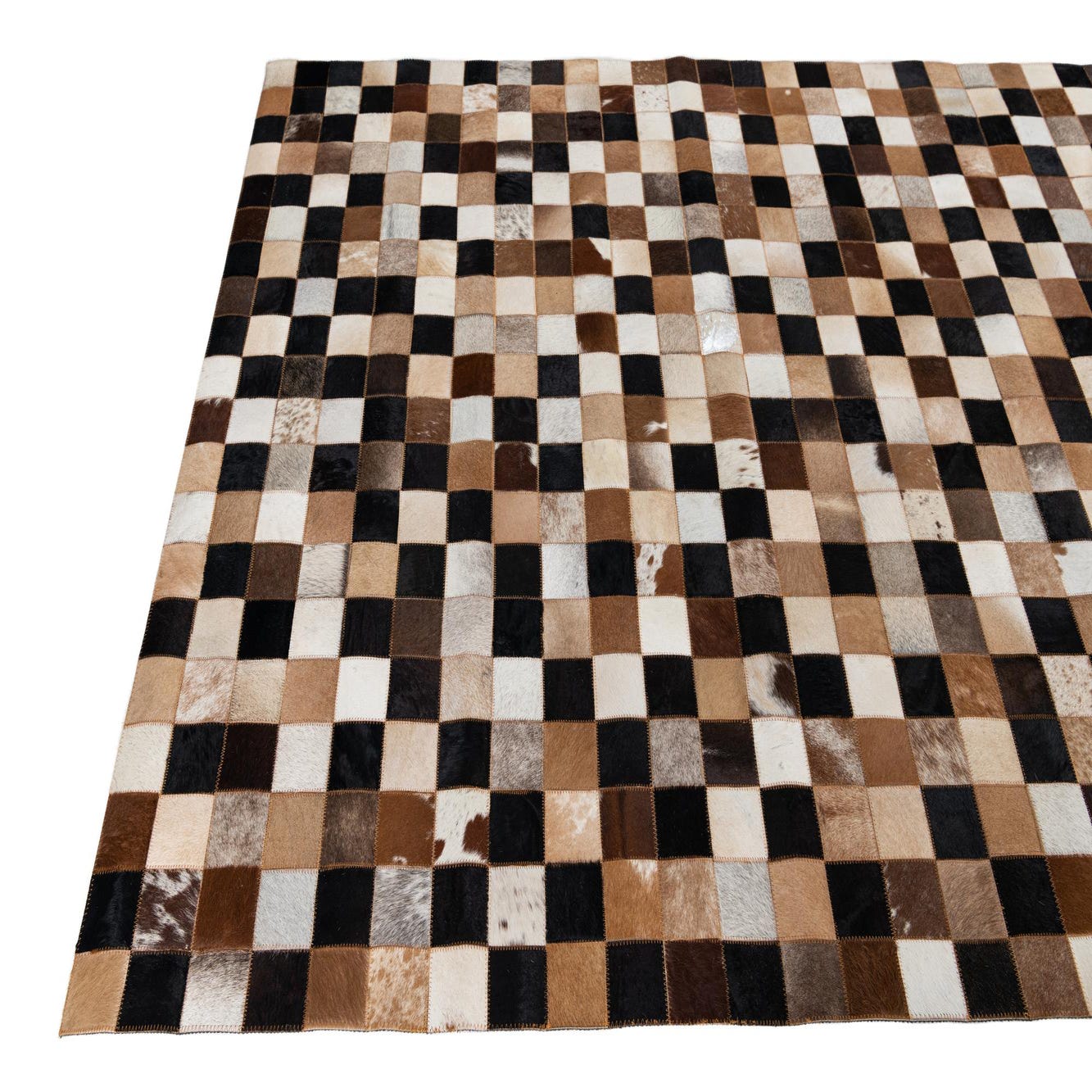 A 5x8 rectangular Cowhide Leather rug featuring a modern checkered pattern in multi-colored natural cowhide patches.