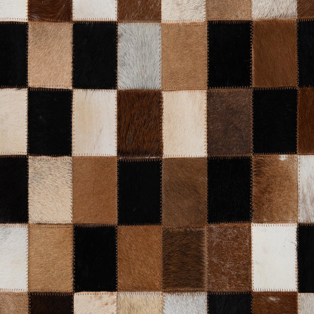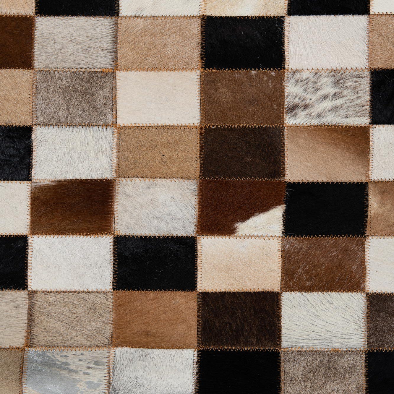 Handmade of cowhide and leather, this rug presents a neat checkerboard patchwork set against a multi background. Small square panels alternate in beige, black, brown, ivory, tan and light brown, producing a clean geometric rhythm with subtle, natural variation in each patch. The hair-on-hide surface feels soft underfoot while displaying slight directional nap and textural contrast between panels; the hand-stitched seams add a visible, crafted finish that underscores the rug’s construction.