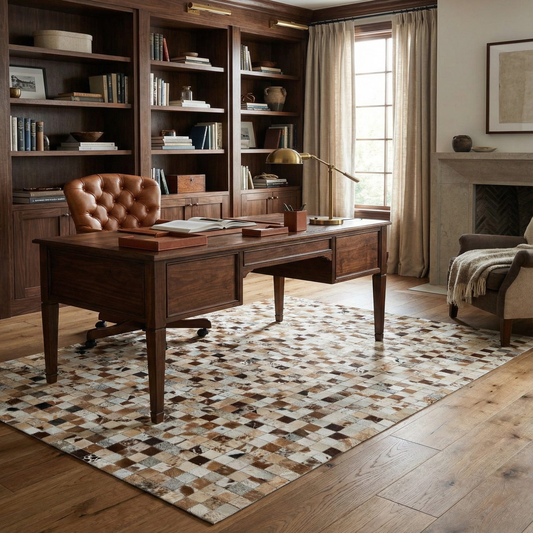 The Cowhide Leather 5x8 rug presents a distinctive mosaic of natural hues, incorporating a palette of beige, brown, light brown, silver, and a multi-colored background that effortlessly complements a variety of interior design themes. Its pattern, an array of cowhide patches, expertly hand-stitched in a checkered arrangement, brings a rich texture and organic appeal to any living space.