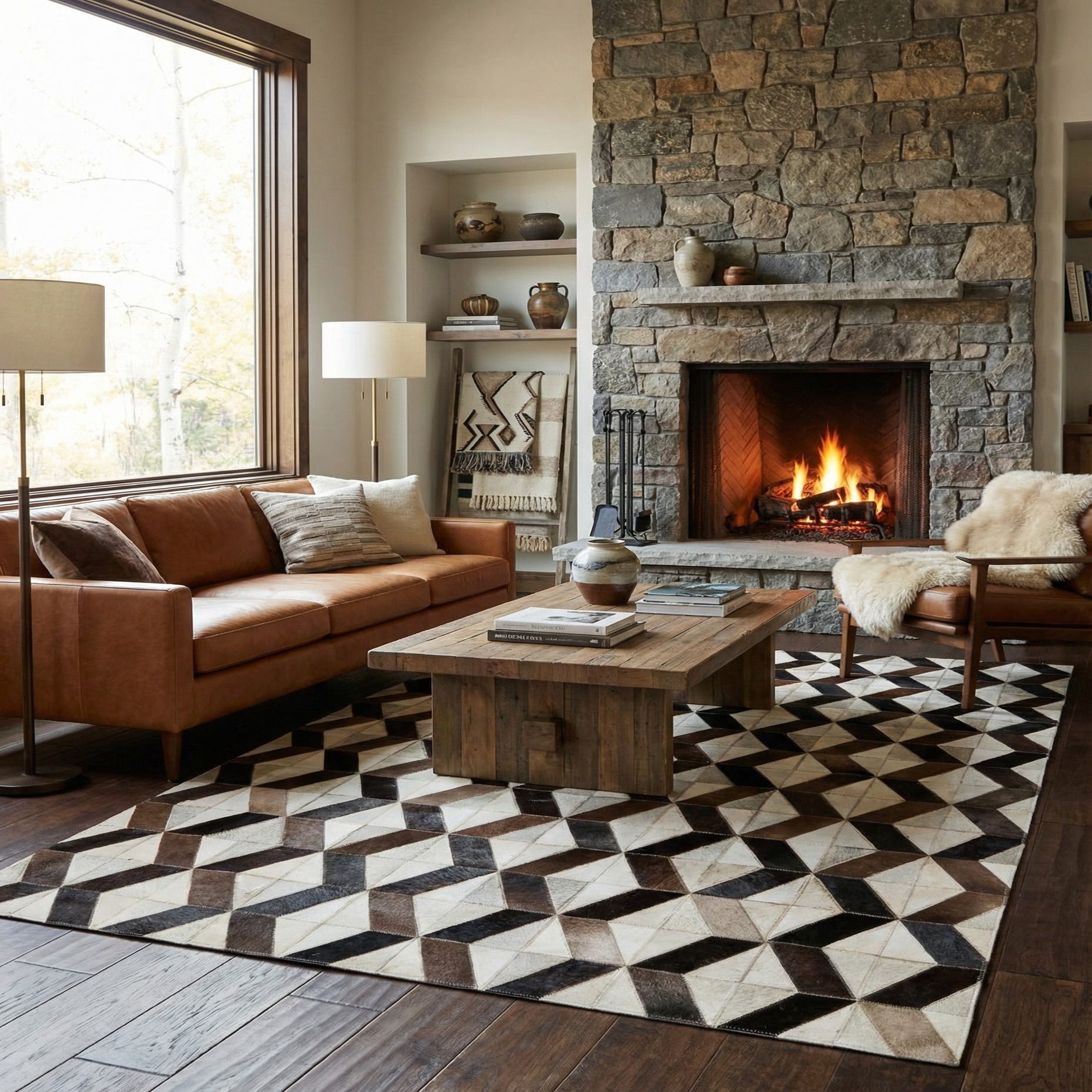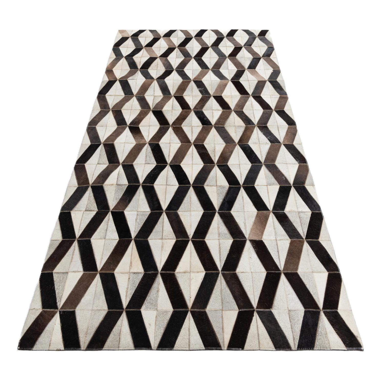 The rug's construction provides a distinctive texture, with the natural qualities of cowhide bringing a tactile element to any space. Its pattern and color scheme allow for versatility in styling, making it an ideal choice for contemporary, rustic, or eclectic interiors. This rug would pair well with minimalist furniture to create a striking contrast, or it could complement a more traditional setting that appreciates the craftsmanship of hand-made items. Its presence in a living room, home office, or den would add character and anchor the decor through its bold geometric design.
