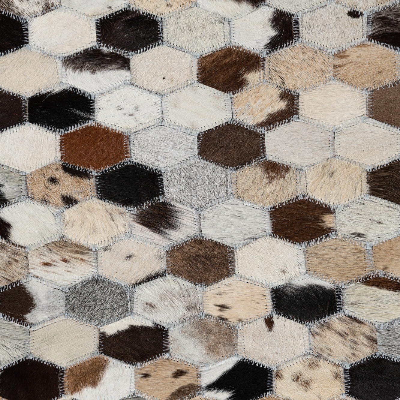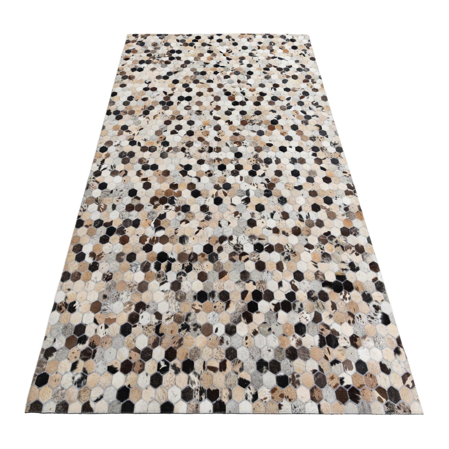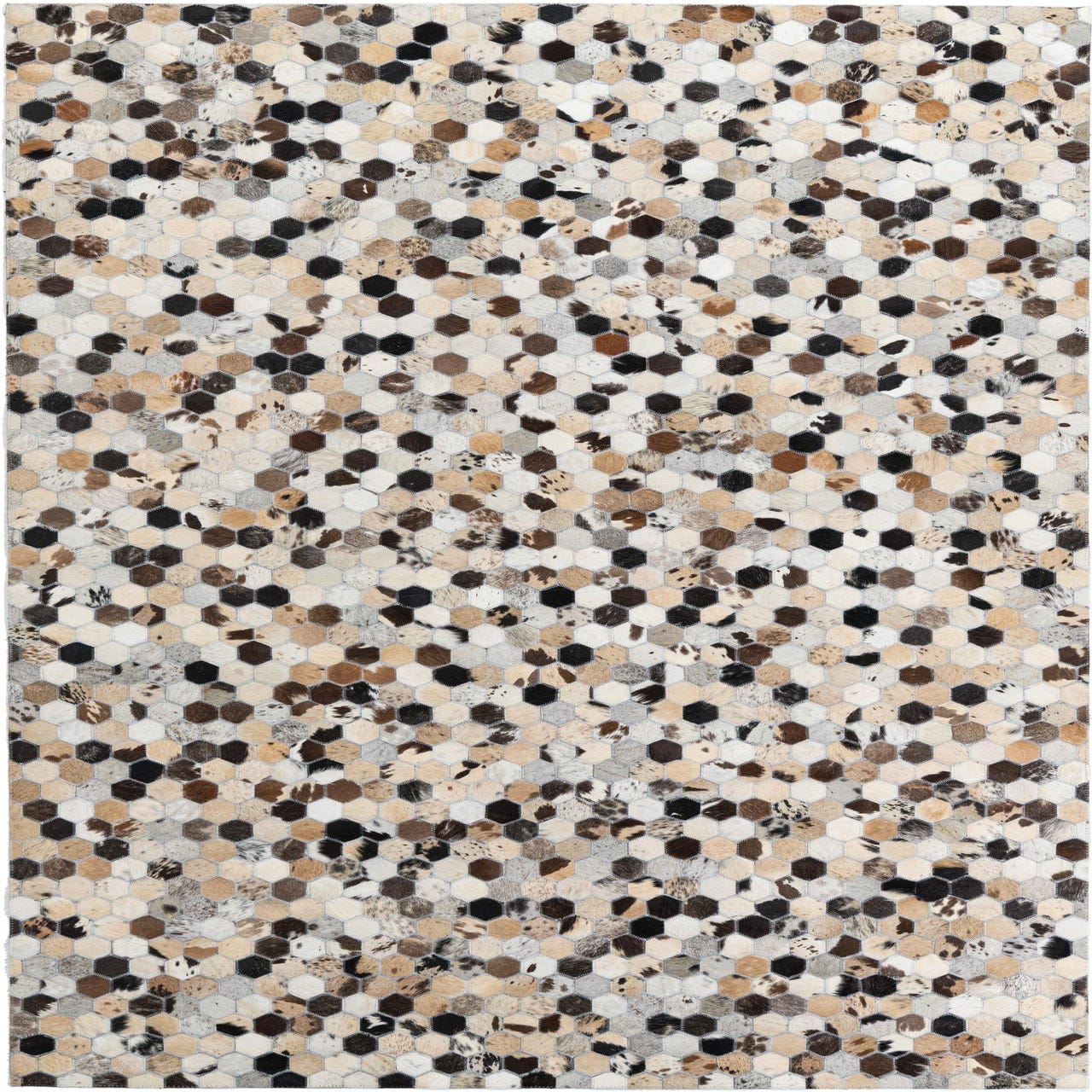 A 5x8 rectangular Cowhide Leather rug featuring a modern, abstract pattern of multi-colored hexagonal patches.