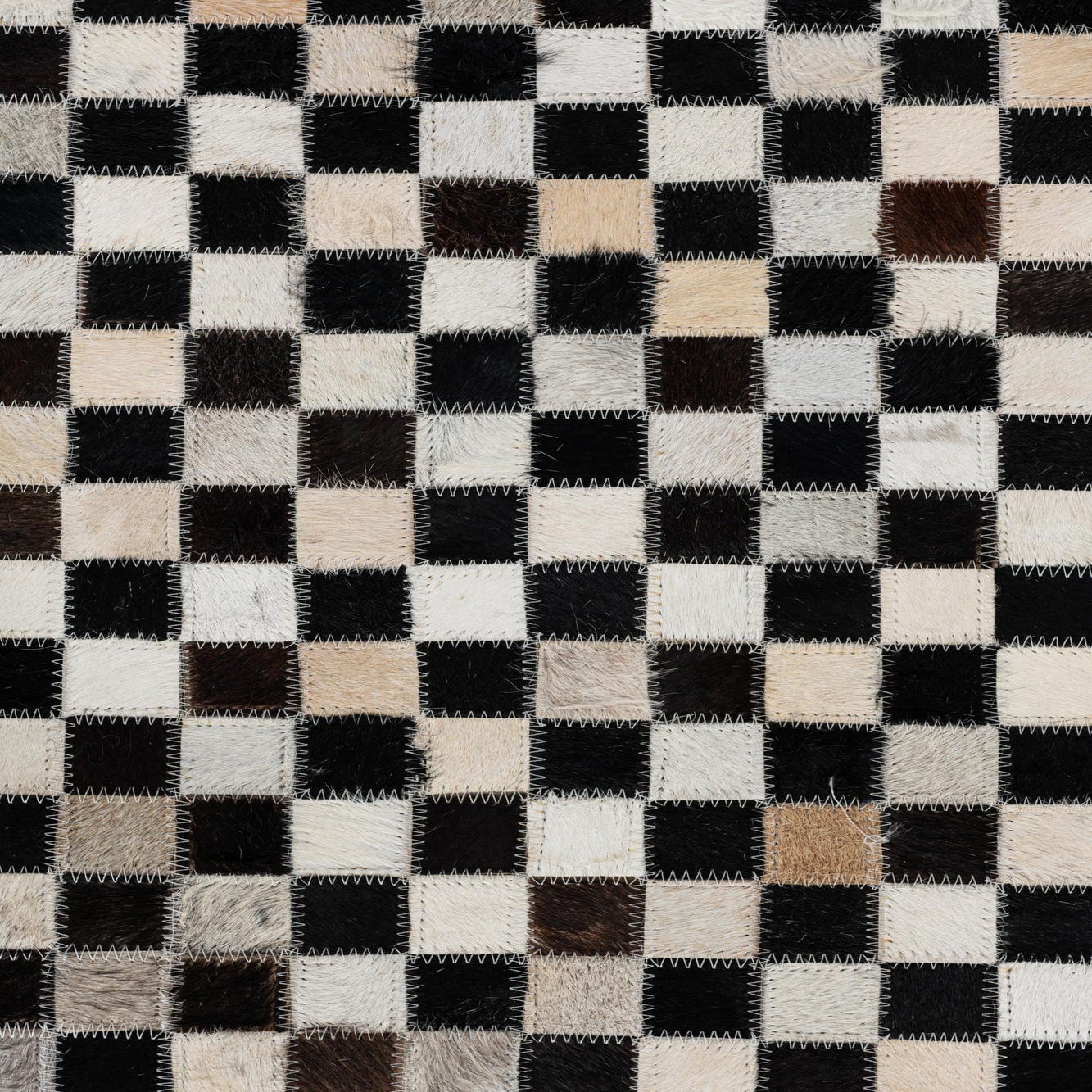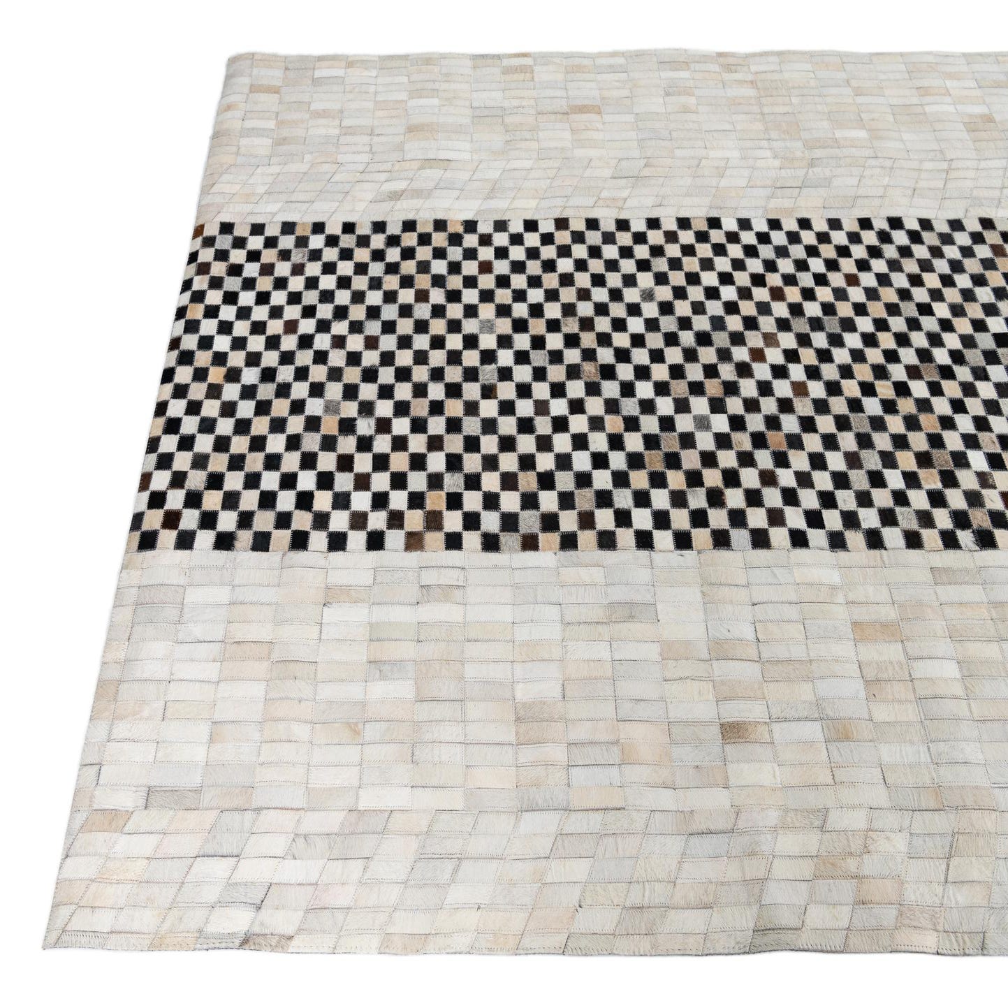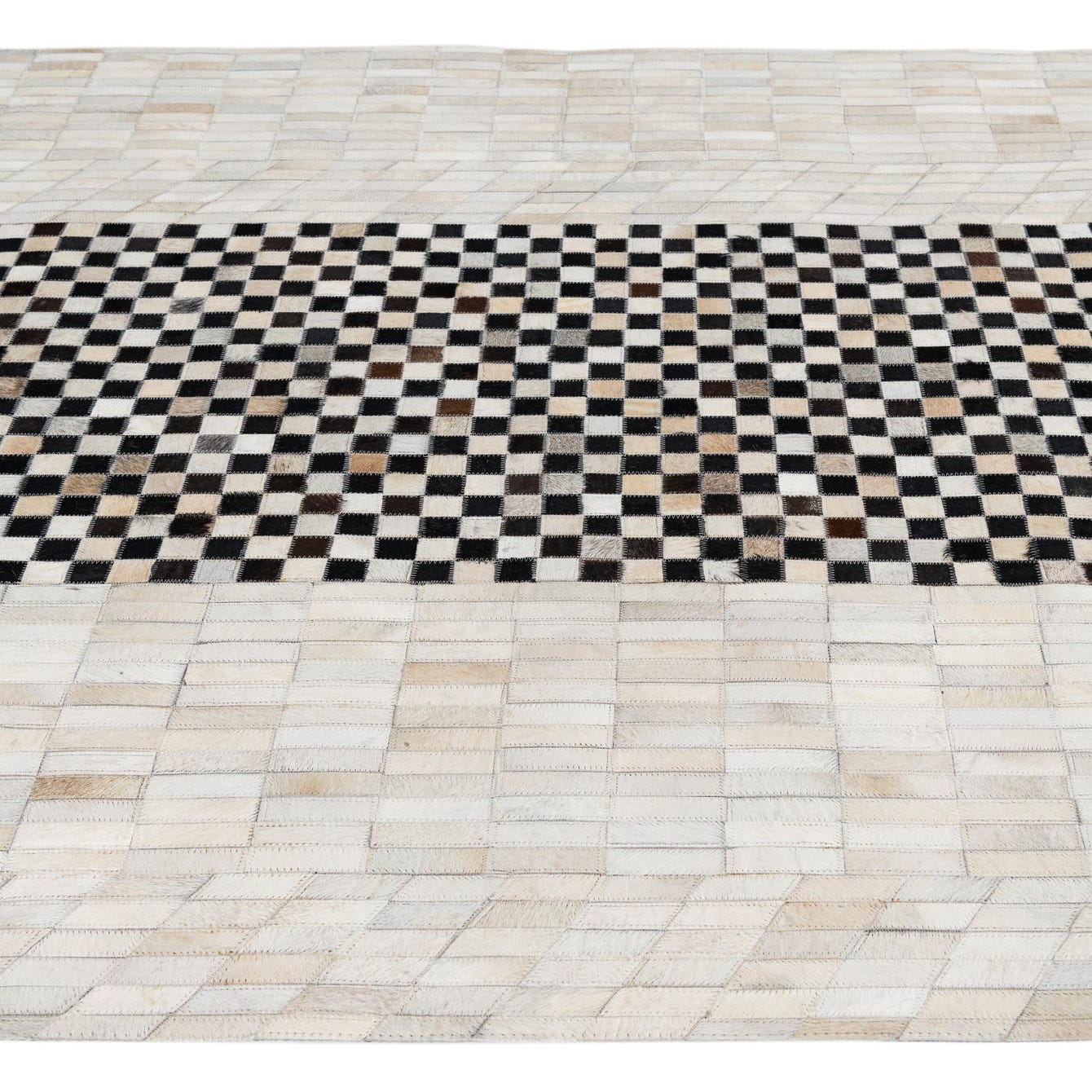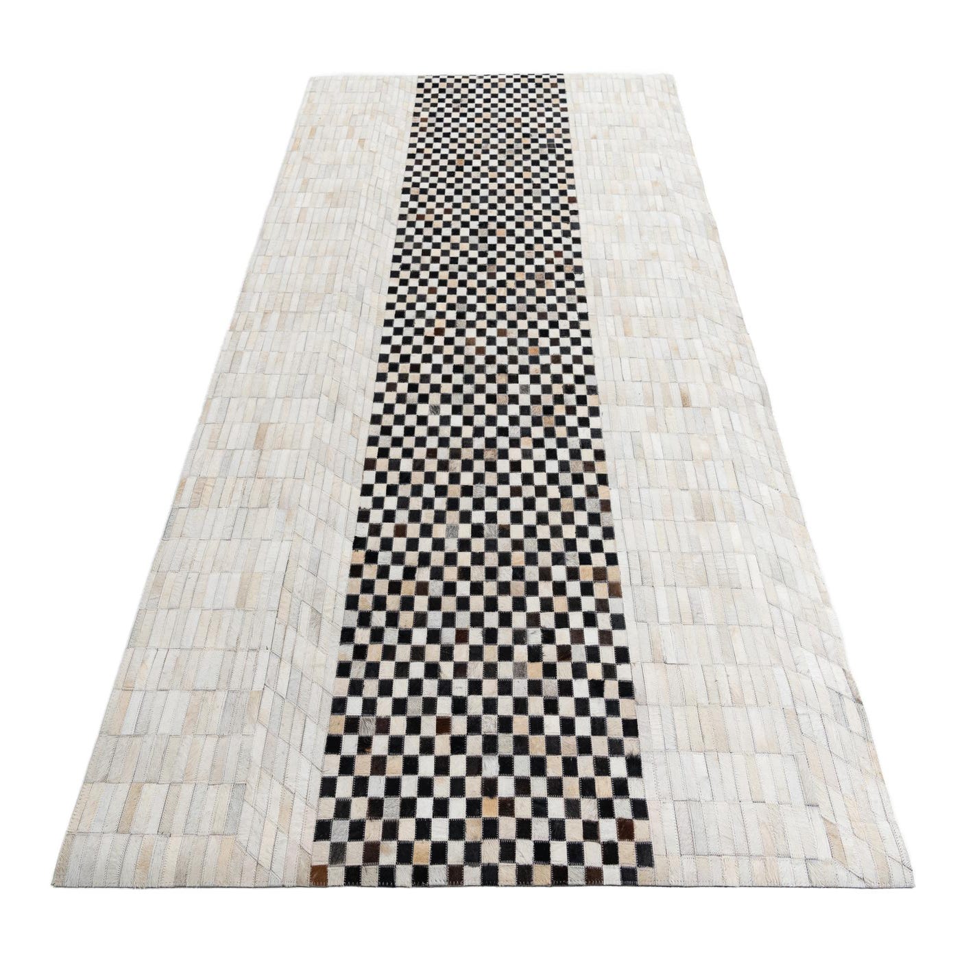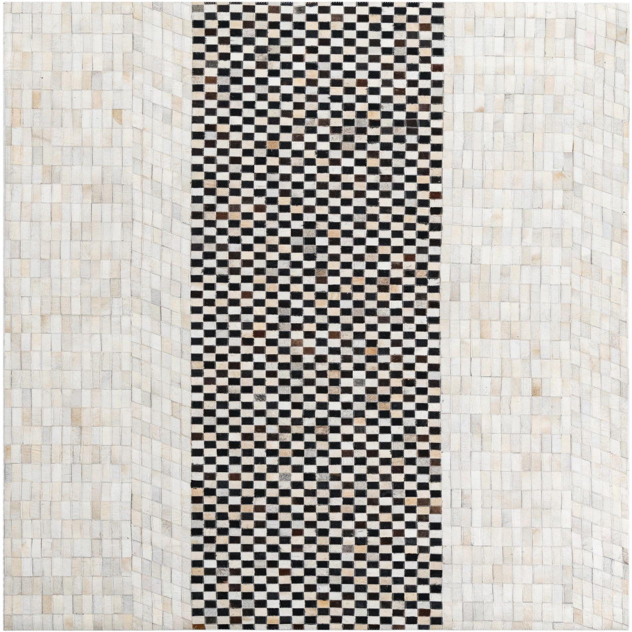 A 5x8 rectangular Cowhide Leather rug featuring a central black and white checkerboard stripe flanked by solid light-colored panels.