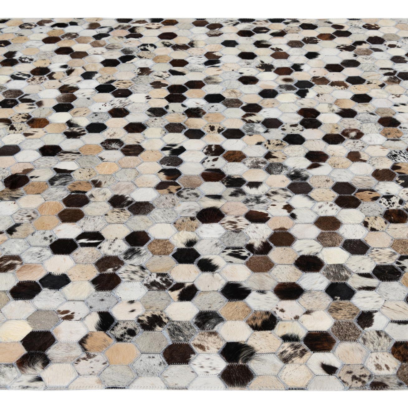 A 5x8 rectangular rug featuring a modern, abstract pattern of multi-colored hexagonal cowhide and leather patches.