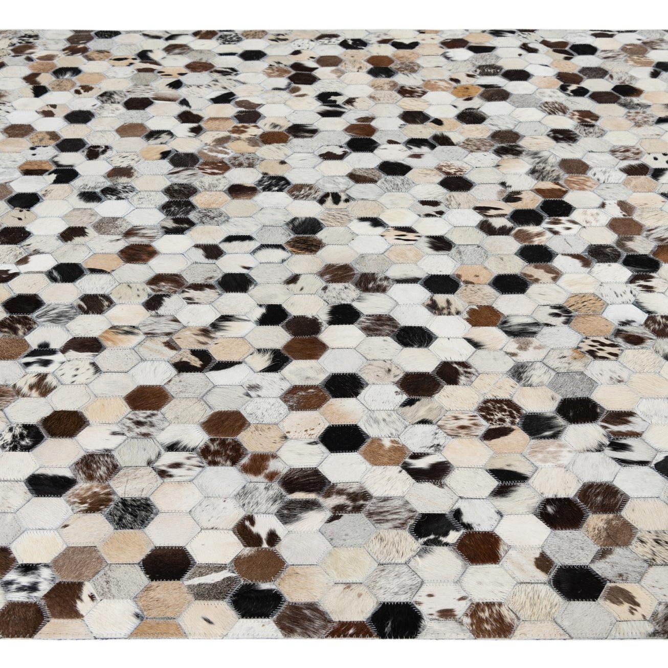 A 5x8 rectangular Cowhide Leather rug featuring a modern, abstract pattern of multi-colored hexagonal patches in varying shades of brown, black, and white.