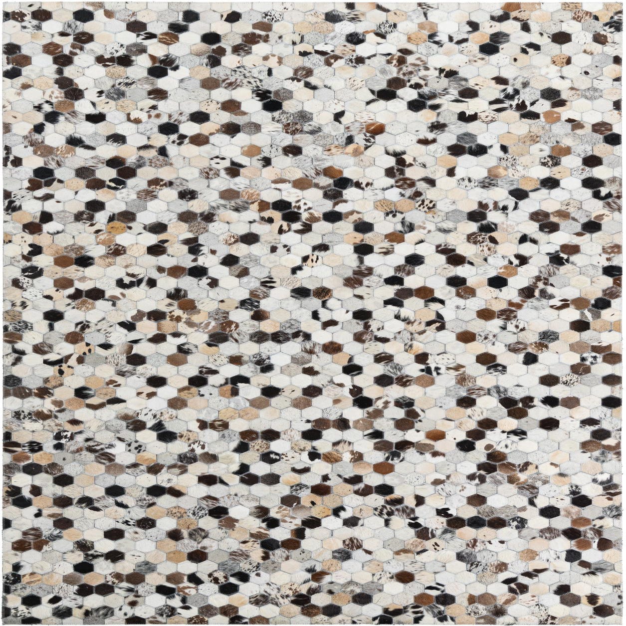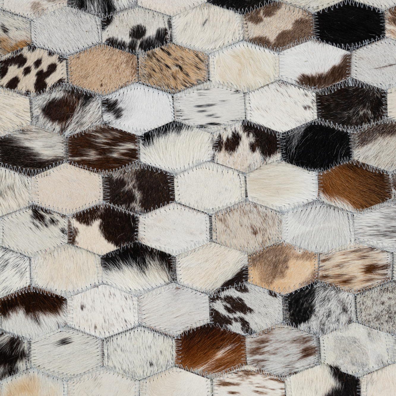 Part of the Cowhide Leather collection, this 5x8 handcrafted rug is a distinctive piece that combines natural texture with a dynamic pattern. The rug is meticulously pieced together from cowhide and leather, offering a tactile surface that invites touch. A mosaic of hexagons presents a harmonious blend of neutral tones, including beige, black, brown, ivory, and gray, set against a multi-colored background. The rug's diverse color palette provides versatility, making it a suitable addition to a range of interior design themes, from contemporary to rustic.