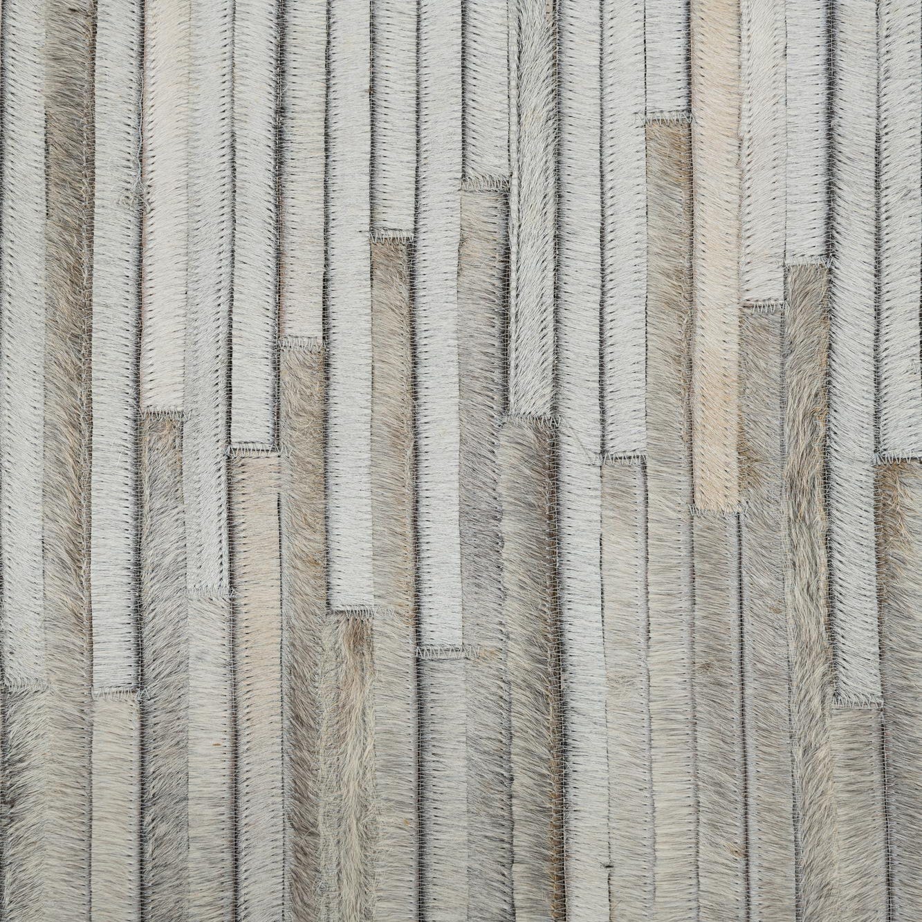 The rug features a dynamic arrangement of vertical stripes that transition in color and tone, emulating the natural variance found in animal hides. The variation in stripe width and the natural sheen of the material contribute to the piece's visual depth.