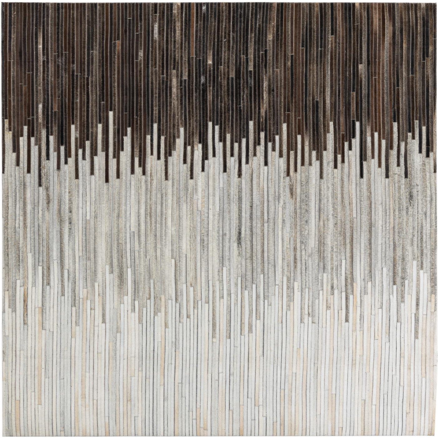 A 5x8 rectangular Cowhide Leather rug featuring a modern stripe pattern with a gradient from dark brown to light gray and white.