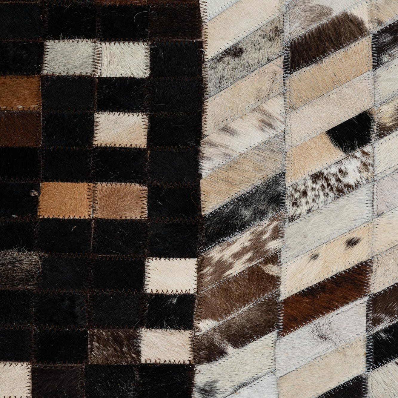 The texture of this rug is indicative of its cowhide and leather construction, offering a distinctive feel underfoot. The natural materials bring an organic and earthy aesthetic, allowing for versatility in styling options. It is well-suited to interiors that aim to incorporate natural textures and rustic elements, such as farmhouse, bohemian, or modern industrial spaces. Additionally, this rug could serve as a striking contrast piece in a more minimalistic or contemporary setting, where its rich textures and neutral hues can add depth and warmth.