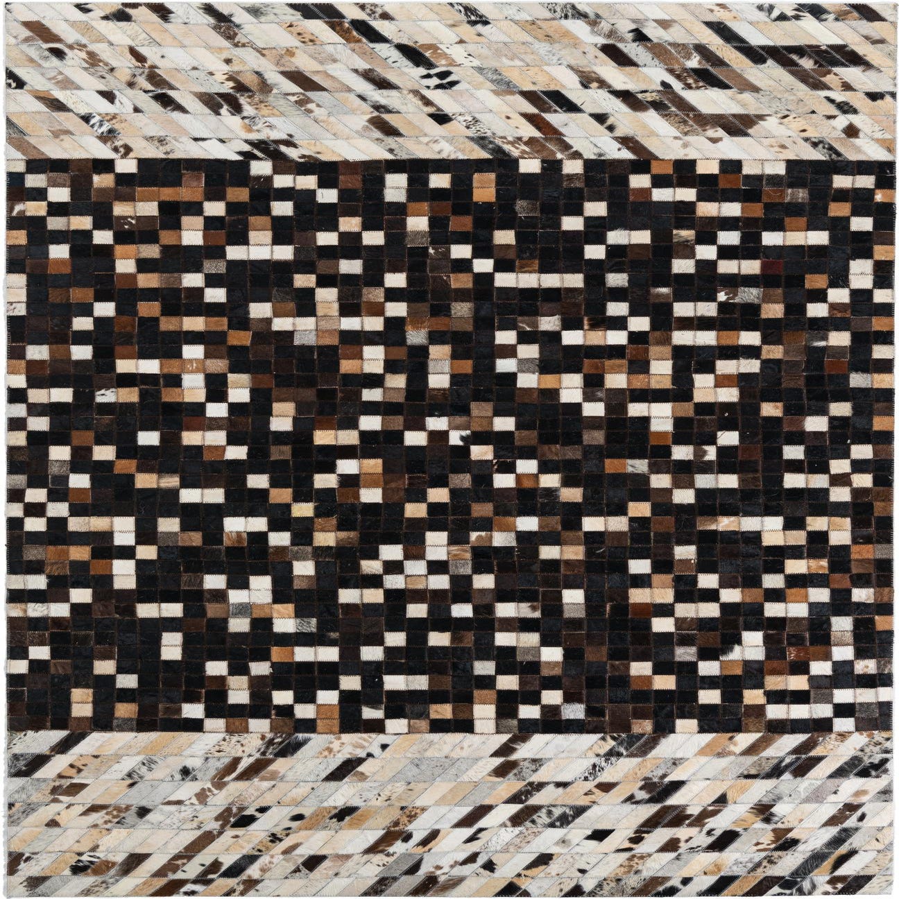 A rectangular 5x8 modern cowhide rug featuring a multi-colored abstract pattern with dark squares in the center and light diagonal stripes on the ends.