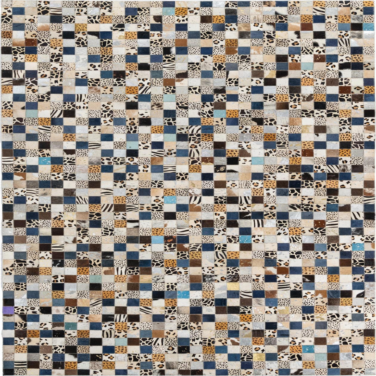 This Cowhide Leather rug, handcrafted from cowhide and leather, presents a bold and dynamic design. Measuring 5x8, the piece features a patchwork pattern that vividly combines a variety of colors, including beige, black, blue, brown, gray, green, navy blue, tan, and turquoise, set against a multi-colored background. The arrangement of colors and textures forms a mosaic that adds visual interest and tactile richness to any space.