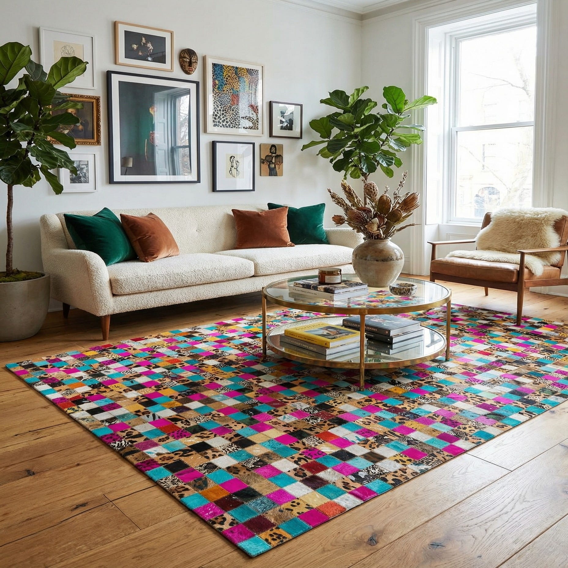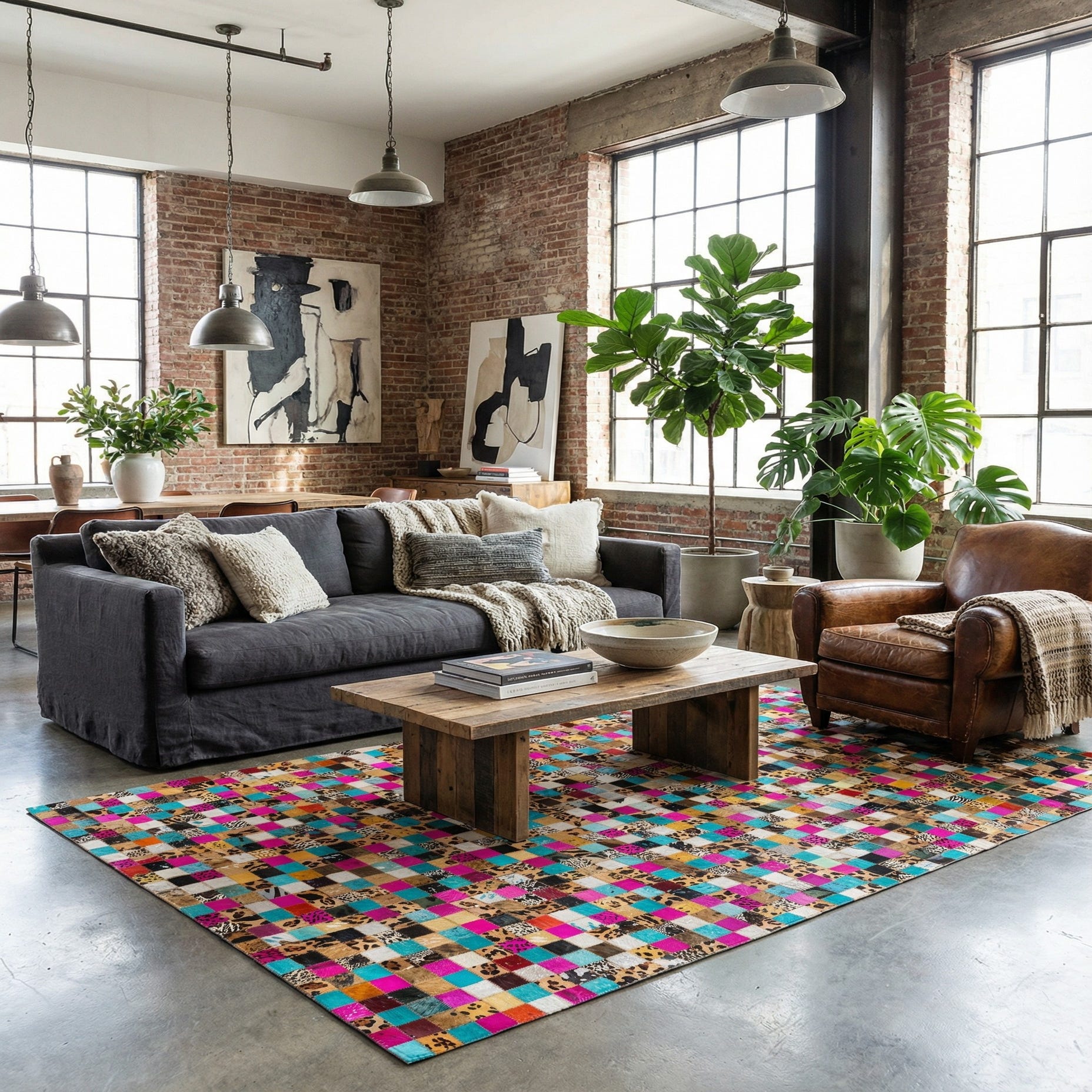 In terms of interior design scenarios, this Cowhide Leather rug would work as a statement piece in a minimalist space, grounding the room with its texture and color variety. It could also complement a modern living room with its splash of colors, lending warmth and sophistication to sleek furniture. In a creative office or a stylish boutique, the rug can serve as an artistic centerpiece, reflecting a bold and innovative spirit.
