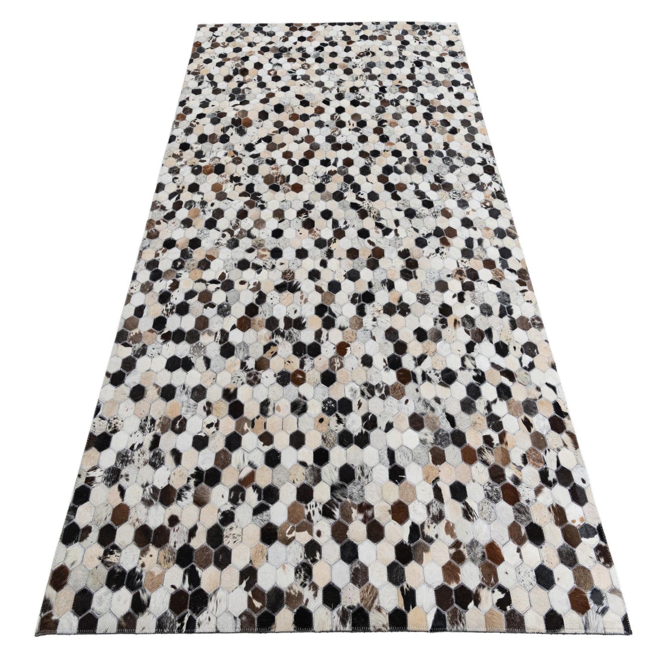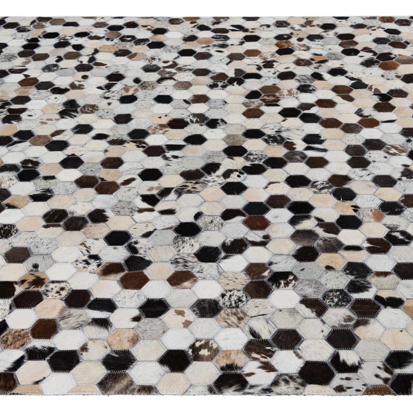 A rectangular 5x8 modern cowhide rug with a mosaic of multi-colored hexagonal leather patches in shades of white, black, brown, and beige.