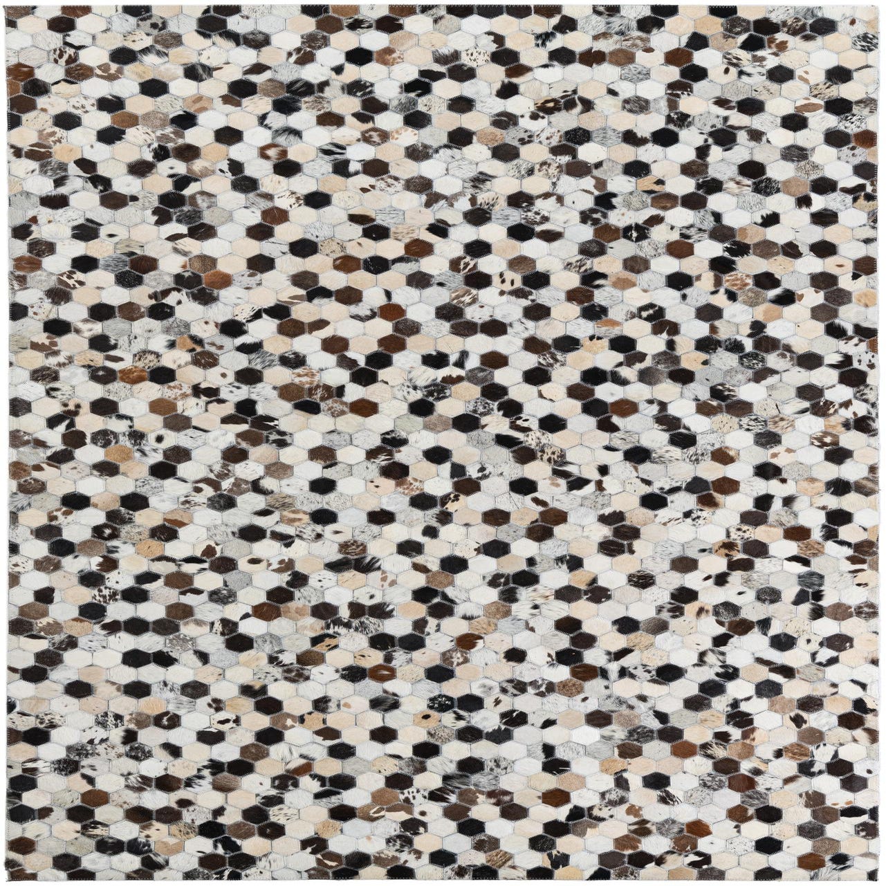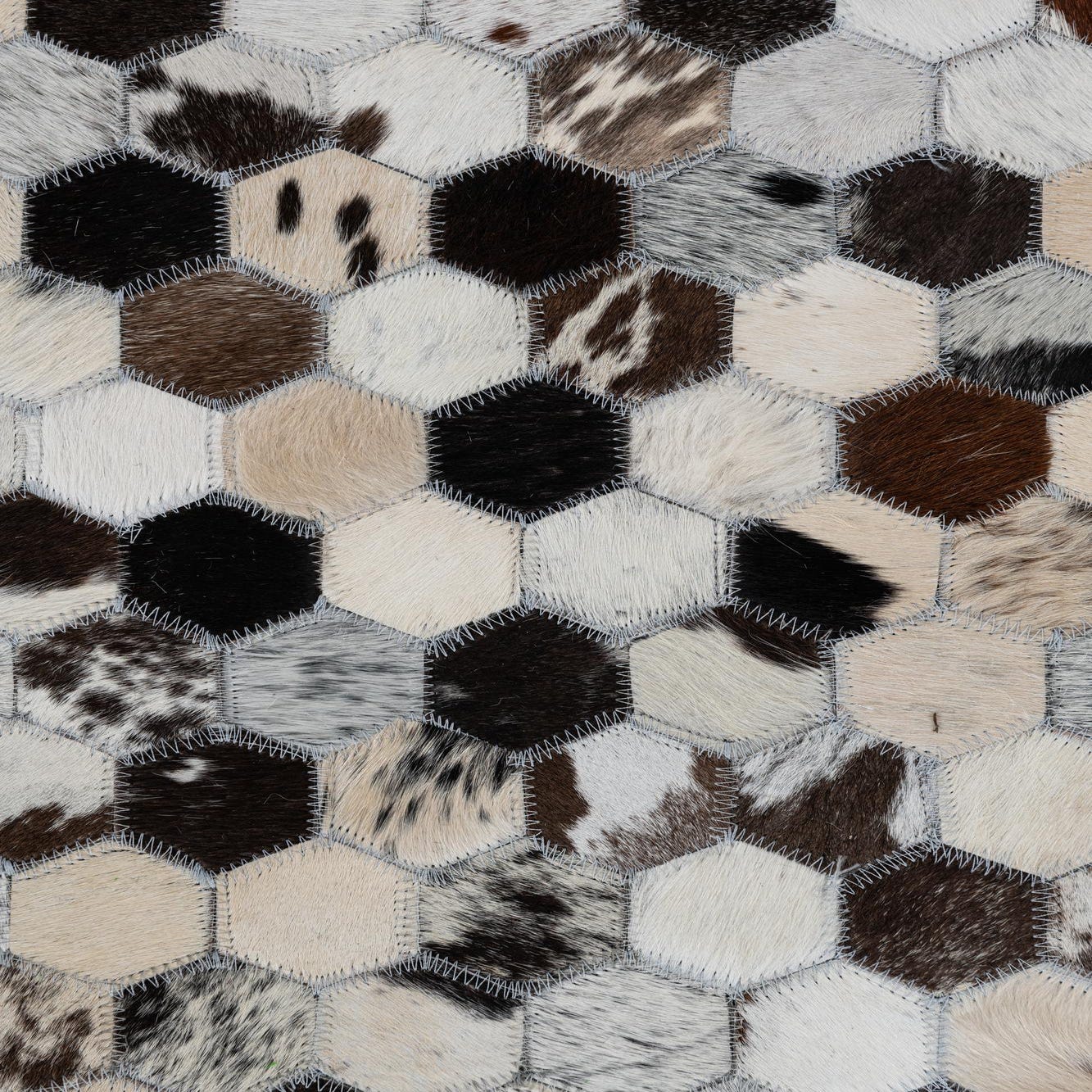 This Cowhide Leather rug offers a mosaic of hexagonal patches in a rich array of colors including beige, black, brown, gray, ivory, tan, and light brown. The handcrafted construction showcases the distinct textures and subtle variations inherent to cowhide and leather materials, giving each piece a unique character.