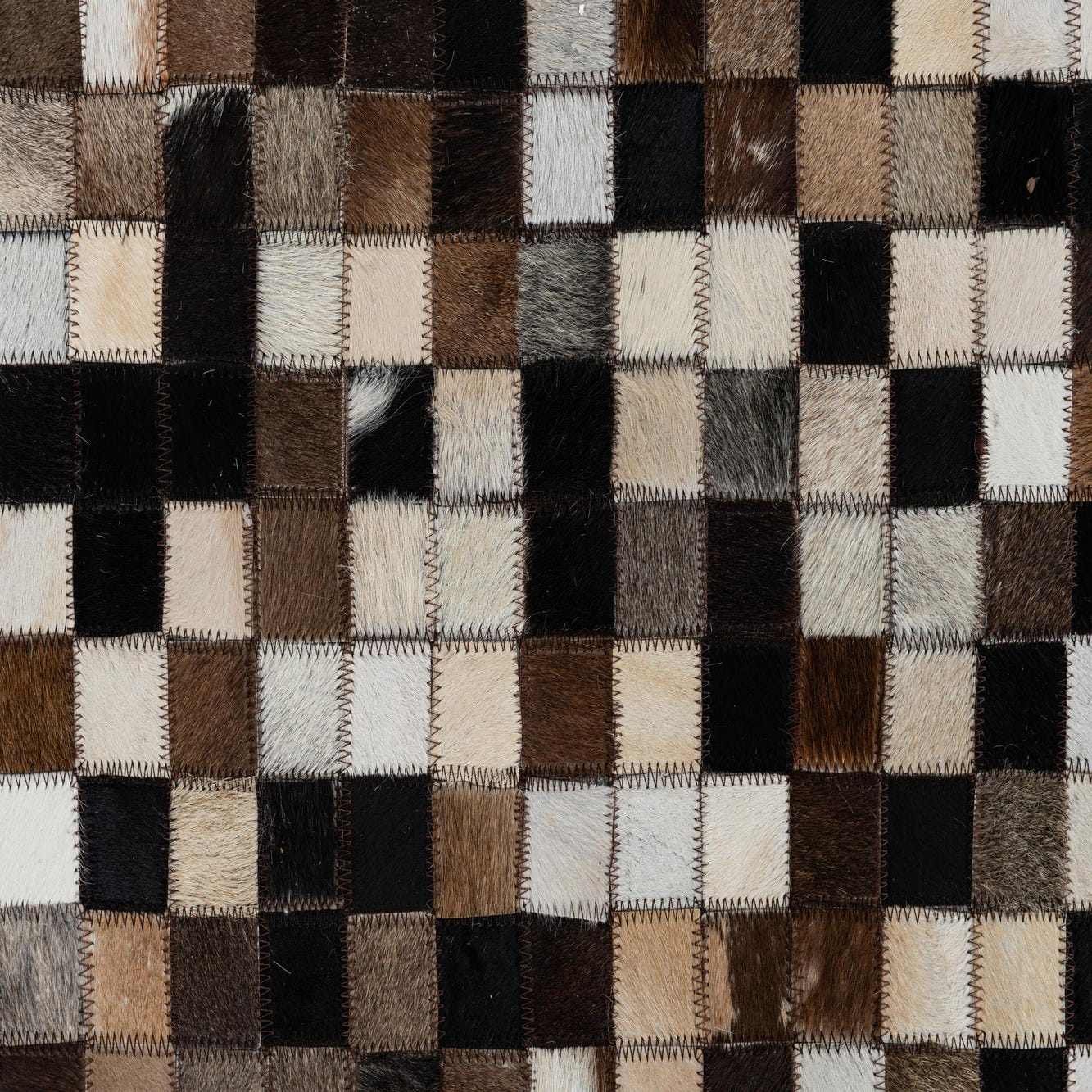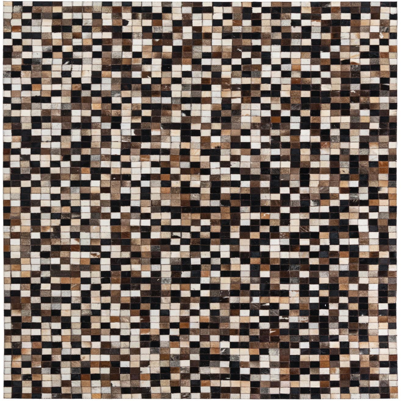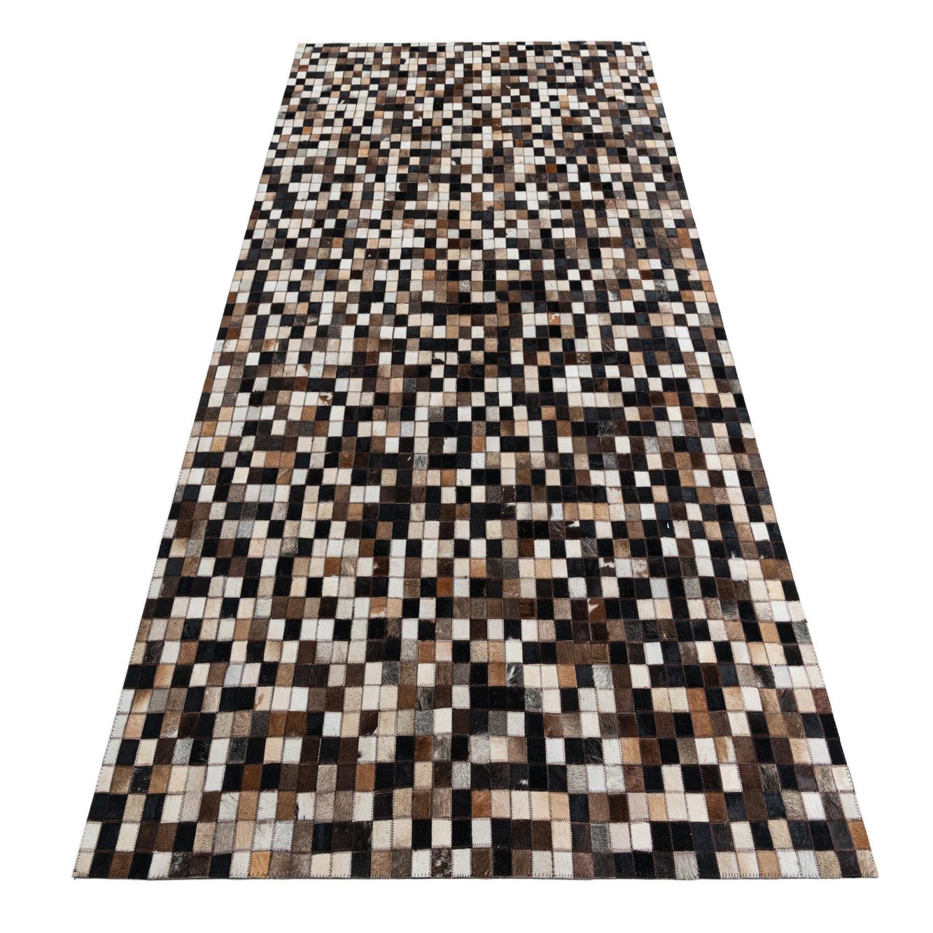A 5x8 rectangular Cowhide Leather rug featuring a modern checkered pattern in multi-colored brown, black, and white squares.