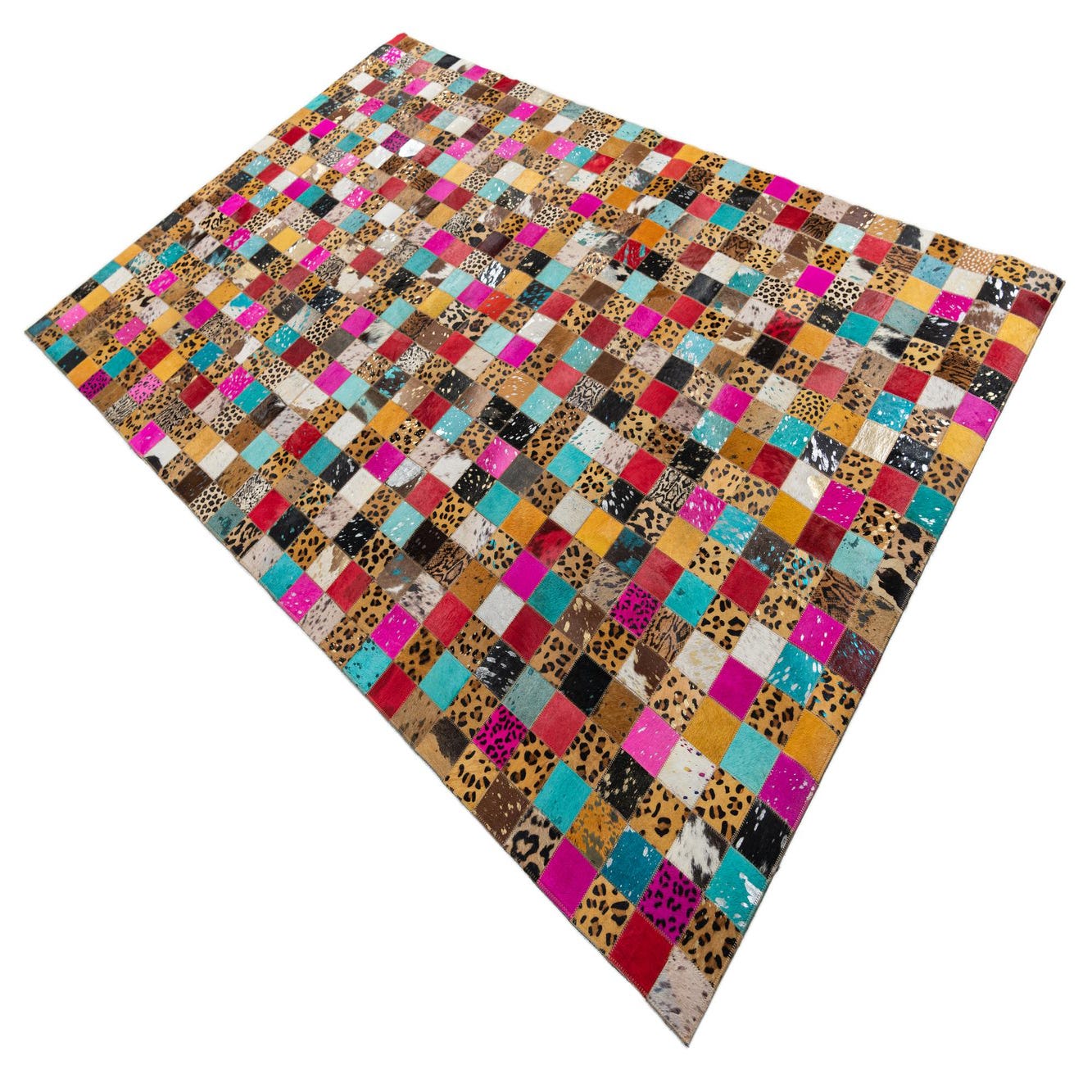 A vibrant 5x8 rectangular rug featuring a patchwork of multi-colored cowhide and animal print squares, ideal for a living room.