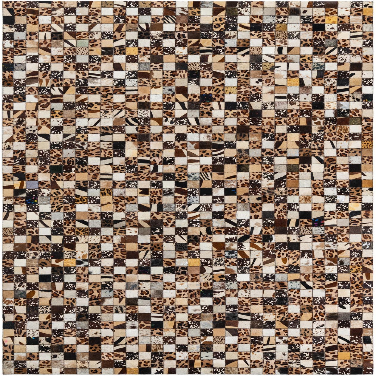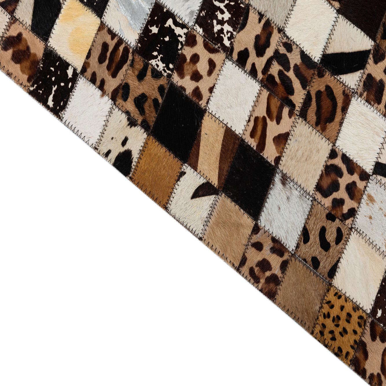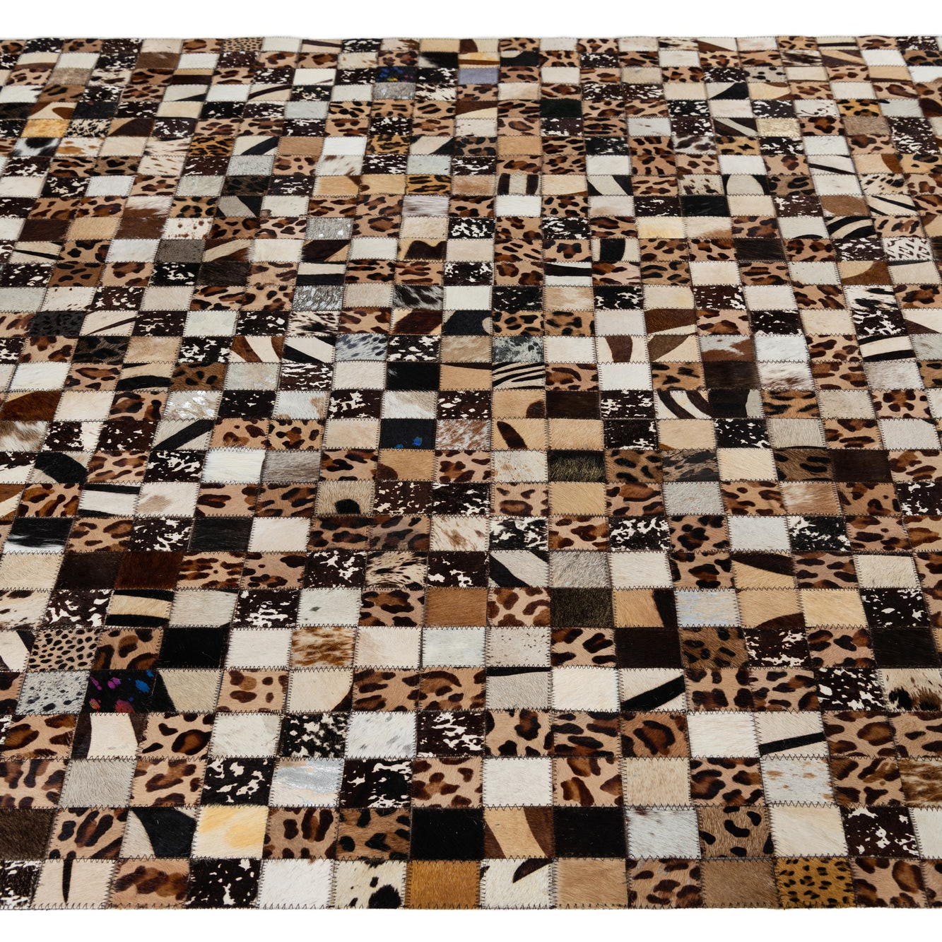 A 5x8 rectangular, multi-colored modern rug featuring a patchwork of cowhide and leather squares with various animal prints.