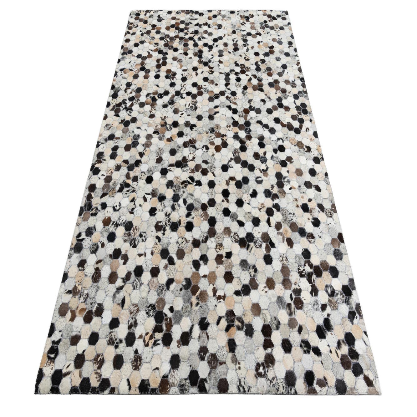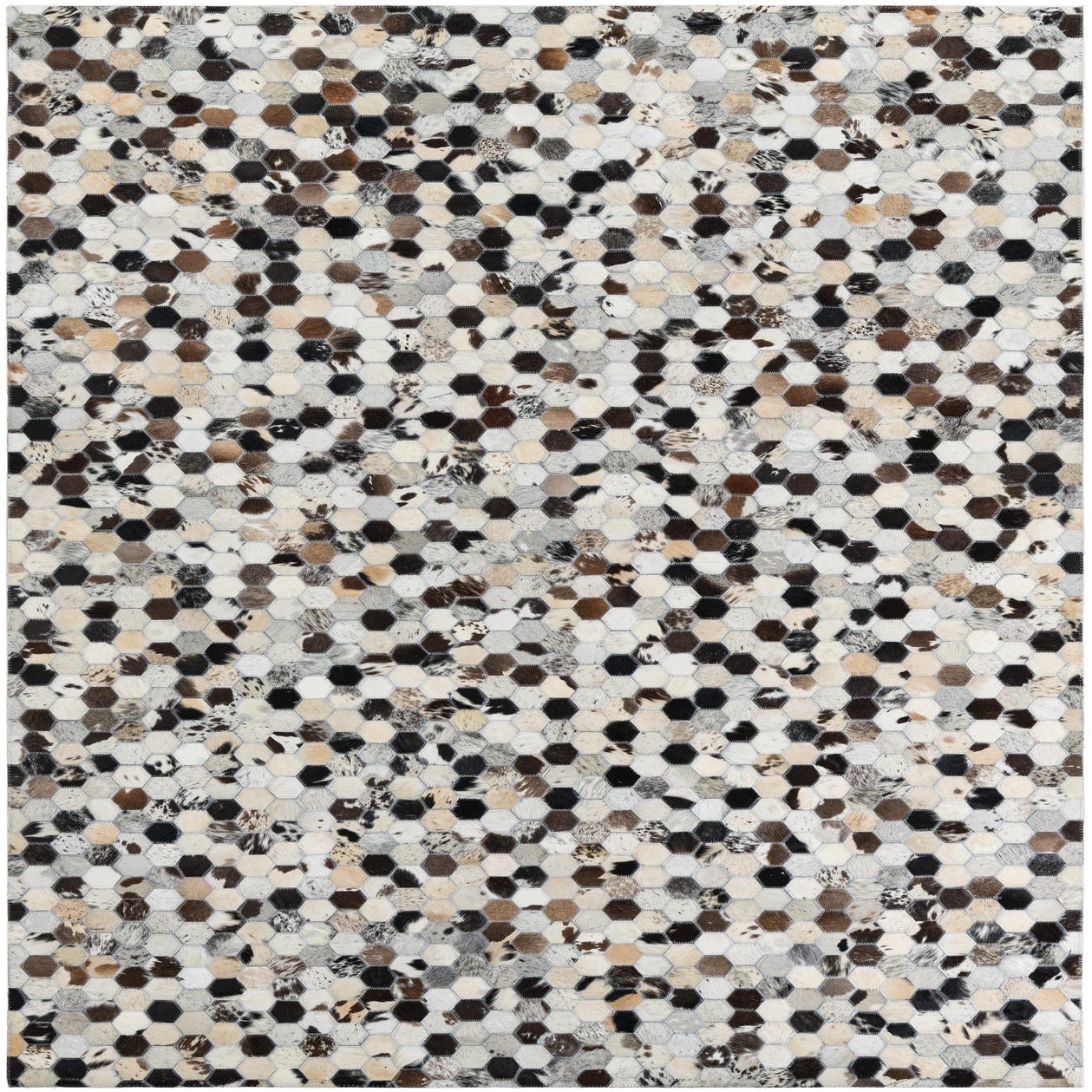 A 5x8 rectangular Cowhide & Leather rug featuring a modern, abstract pattern of multi-colored hexagonal patches in black, brown, and white tones.