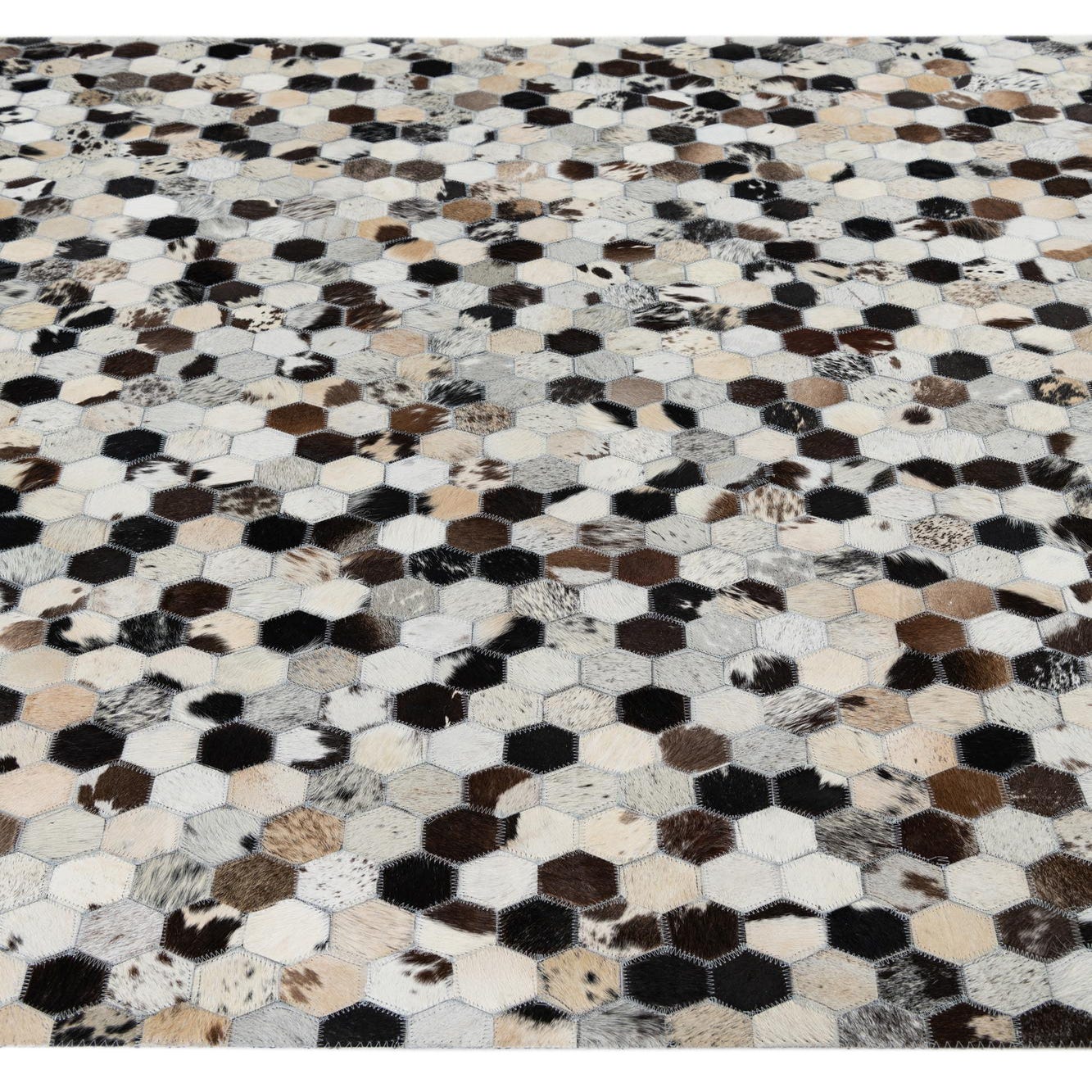 The Cowhide Leather collection rug is a uniquely tactile 5x8 piece that showcases a natural mosaic of cowhide pieces stitched together to form a modern and alluring design. The rug displays an assemblage of hexagonal patches in a rich palette that includes beige, black, brown, ivory, tan, and gray. The handcrafted nature of the rug is evident in the varied texture and tones of the leather, offering an organic and bespoke feel to any space.