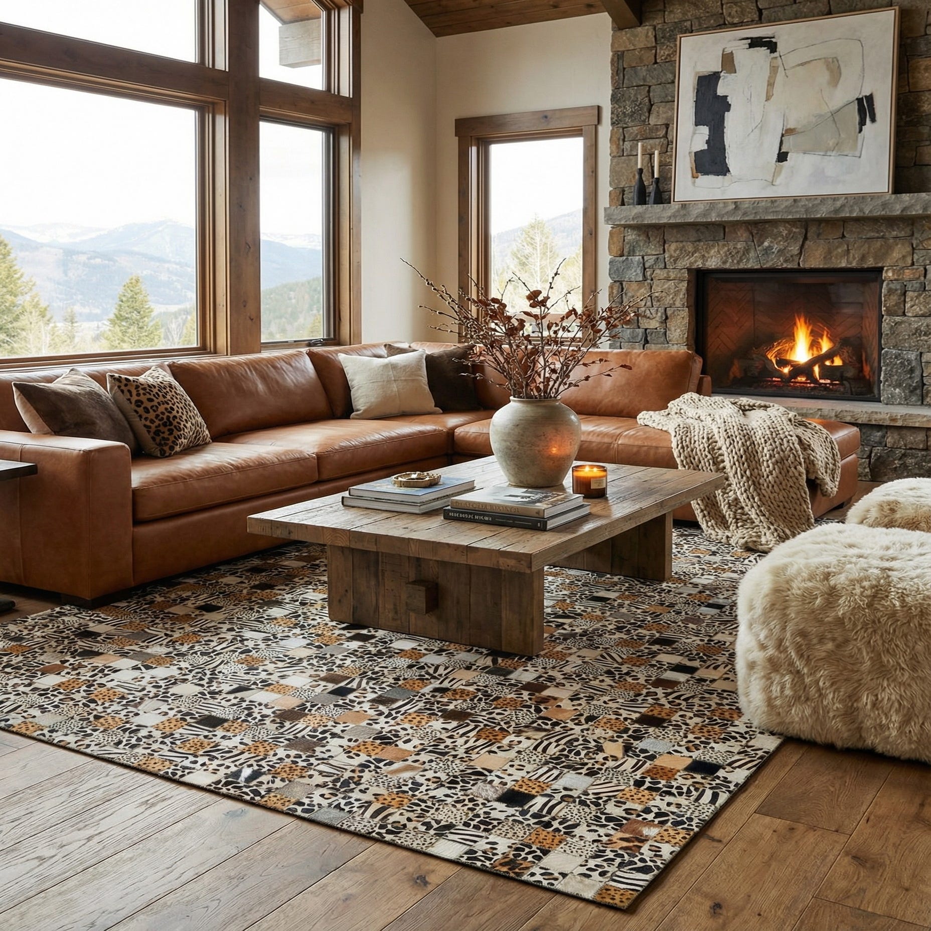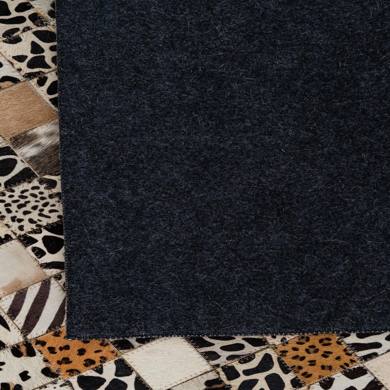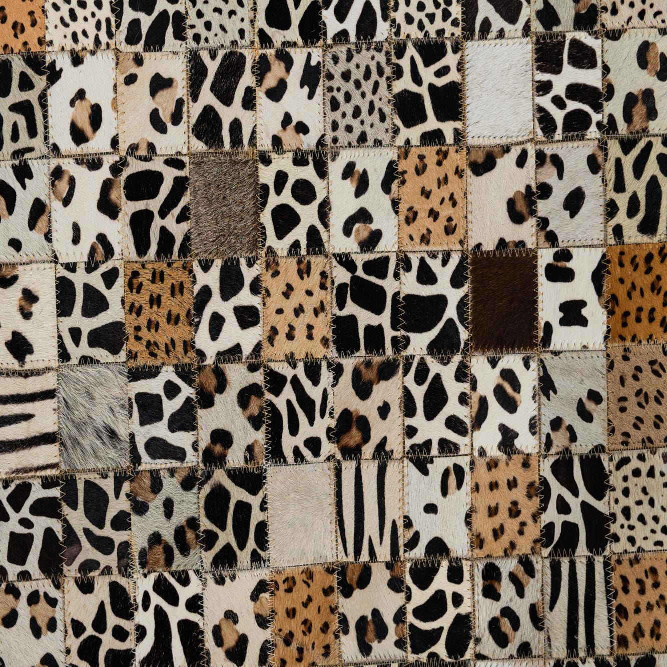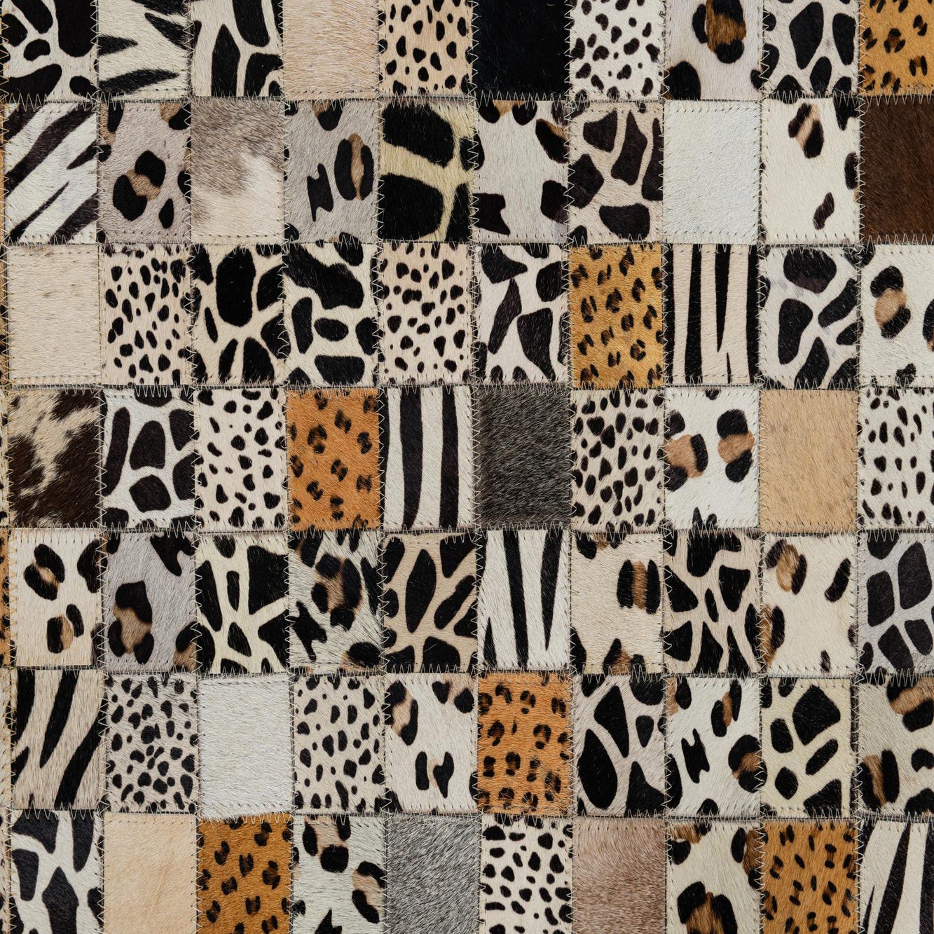 A 5x8 rectangular Cowhide Leather rug featuring a modern patchwork of multi-colored animal prints like leopard, cheetah, and zebra.