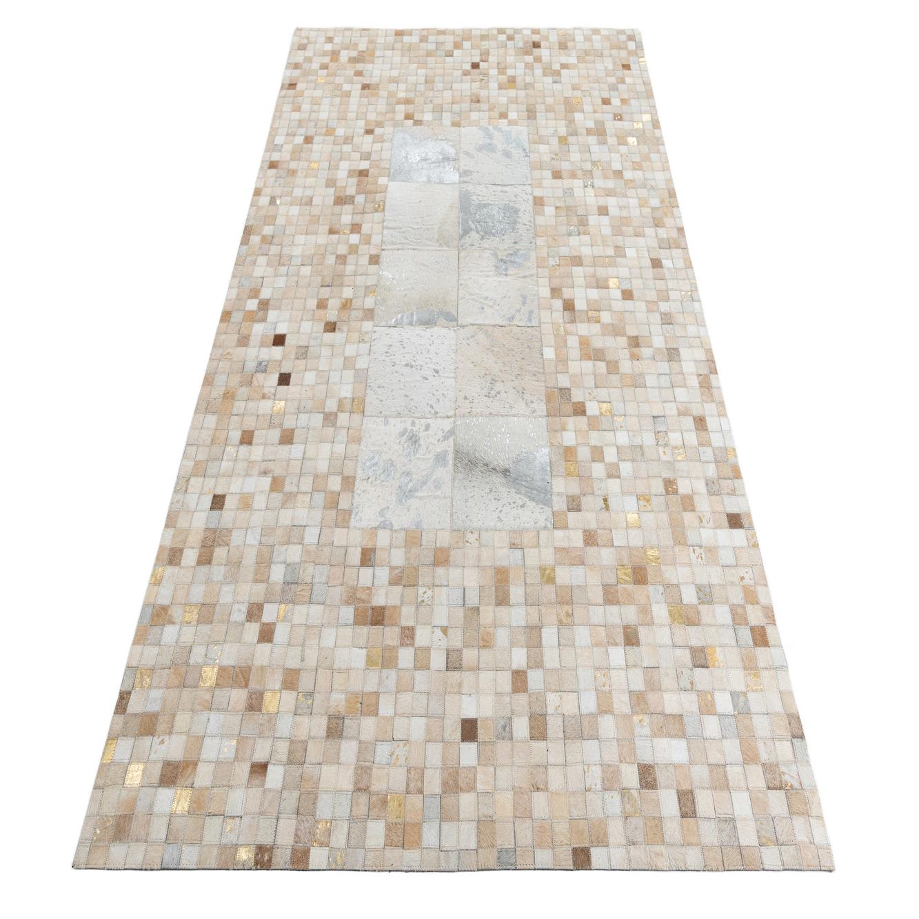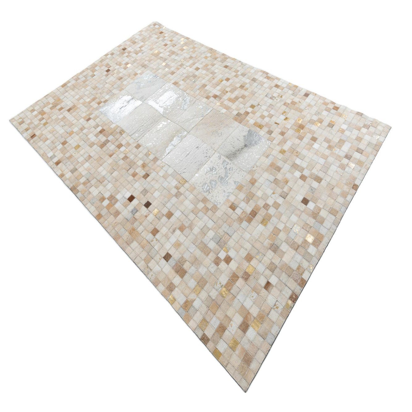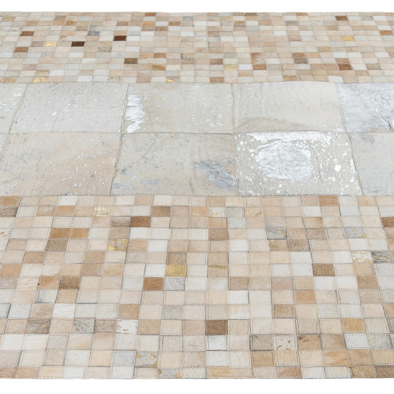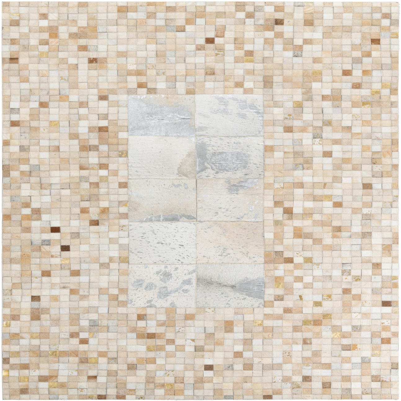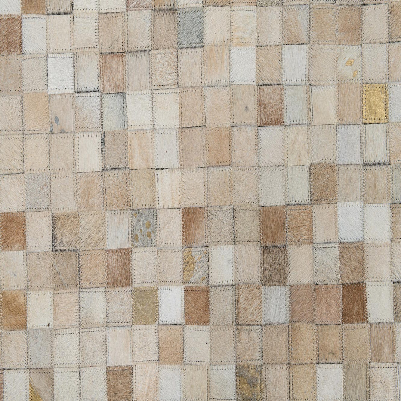 The Cowhide Leather Collection offers an authentic and natural allure with its handcrafted cowhide and leather composition. This 5x8 rug boasts a harmonious mix of neutral shades including beige, gray, ivory, light brown, silver, and gold set against a multi-colored background. The texture of the rug is rich and varied, reflecting the organic quality of the materials. Its mosaic-like pattern, featuring an array of small squares, creates a subtle yet captivating visual interest.