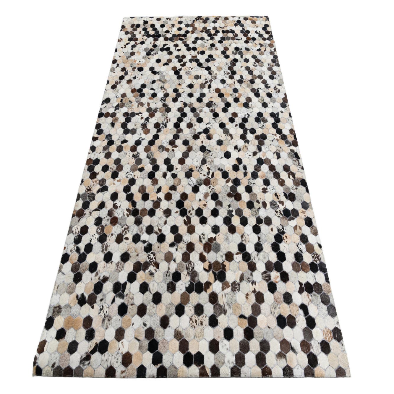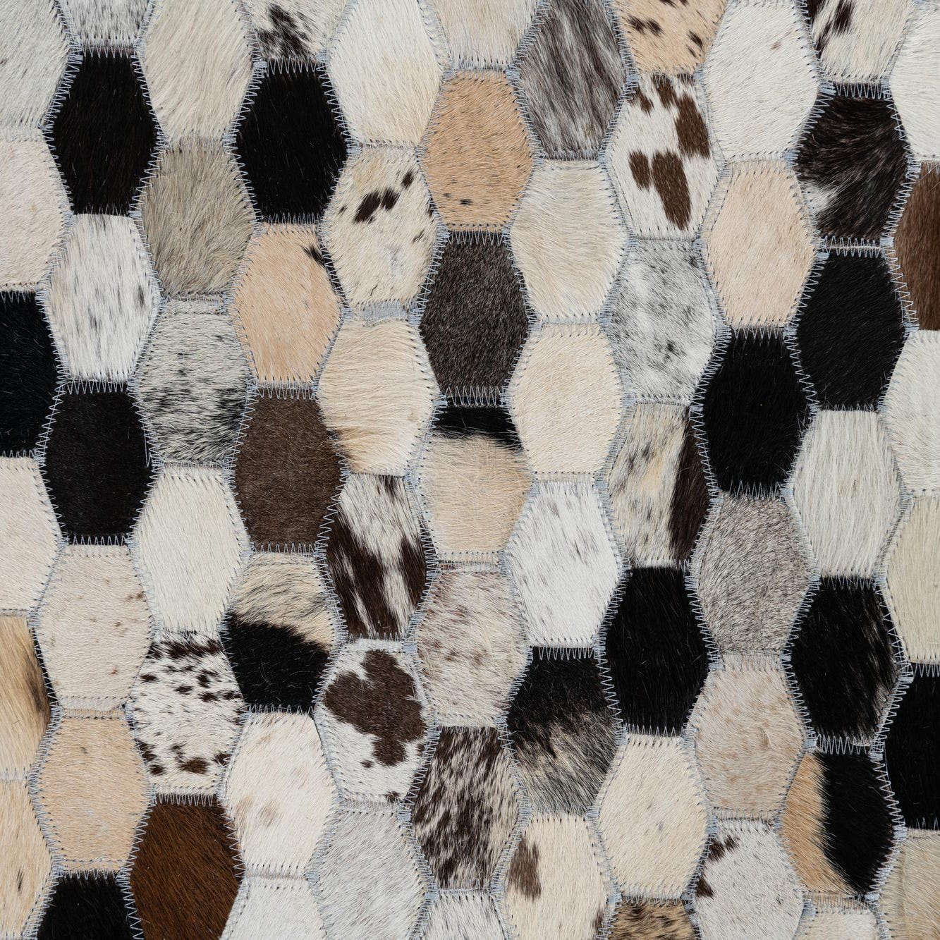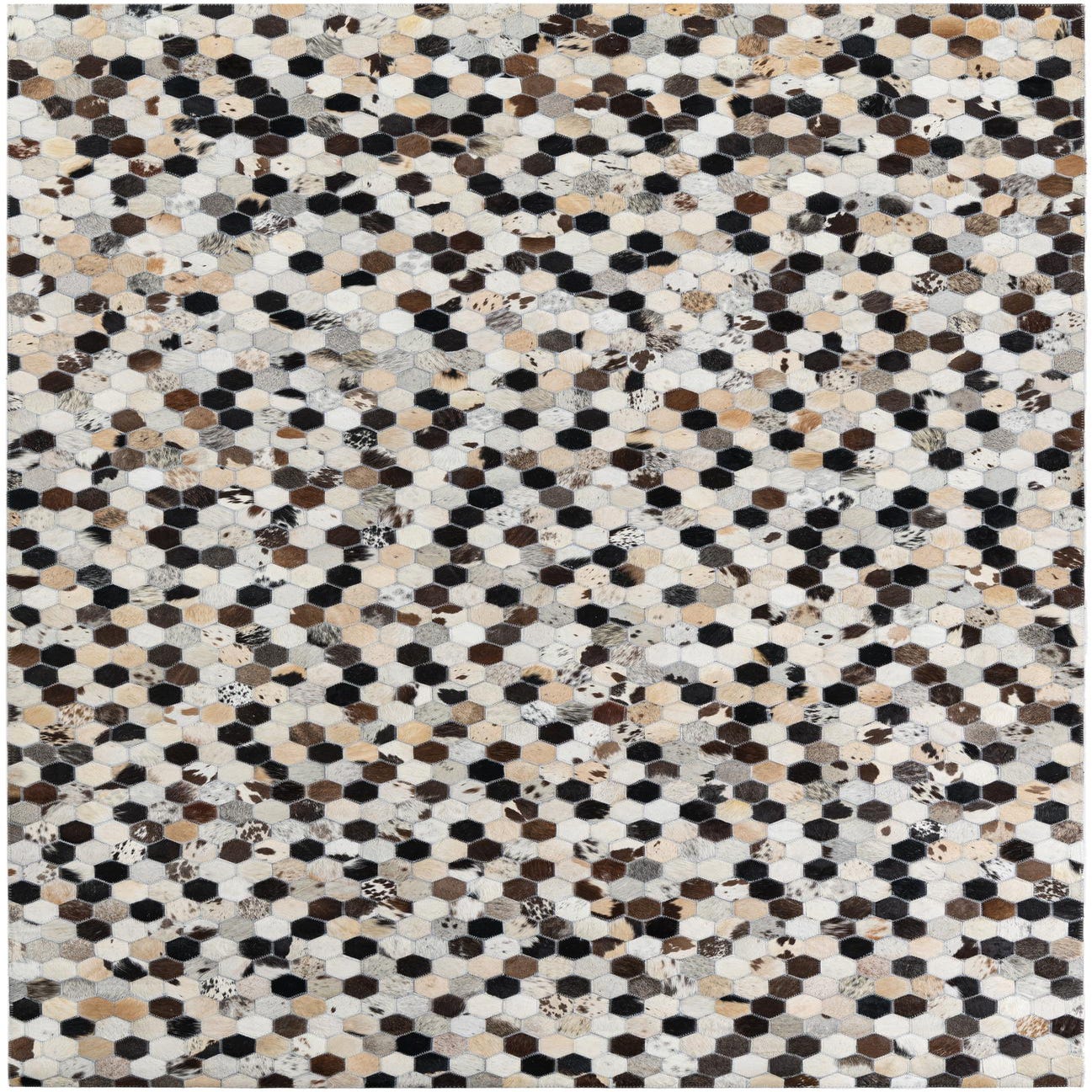 A honeycomb patchwork of small hexagons gives this handmade cowhide and leather rug a measured geometric rhythm. Each patch alternates natural hair-on-hide tones—beige, ivory, tan, brown, gray and black—creating a multi-layered, speckled field with subtle mottling and natural markings from the hides. The surface is tactile, with the short hair offering soft, directional texture against the slightly firmer leather stitching lines that define each hexagon, delivering both visual interest and a grounded, organic feel.