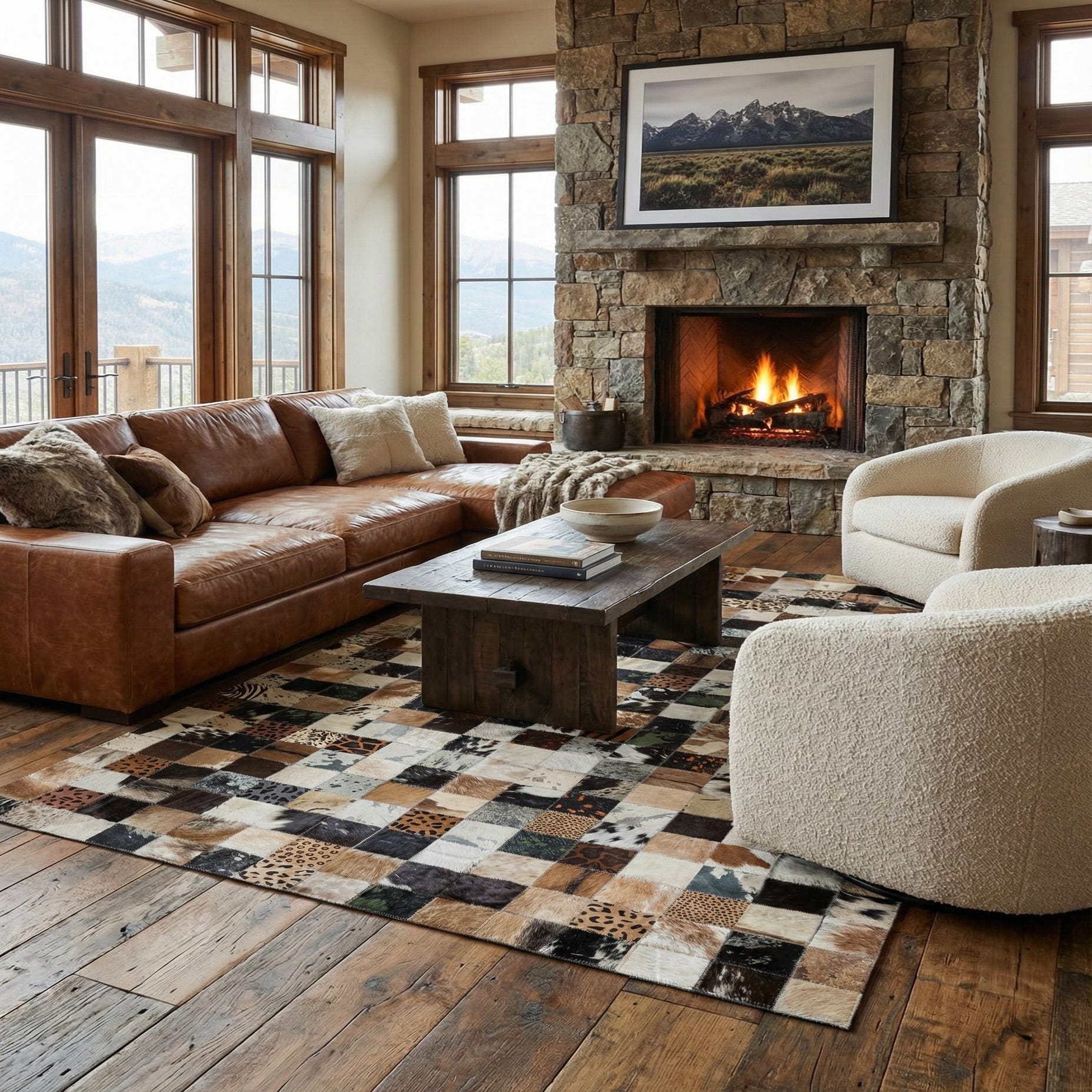 This versatile rug would serve as a striking focal point in a variety of decor settings. It would complement modern and contemporary interiors, especially those with a minimalist aesthetic seeking a touch of warmth and sophistication. Additionally, the neutral and earthy palette would harmonize well with rustic and industrial design elements, while the luxurious cowhide material can elevate a chic, eclectic space that mixes textures and patterns.