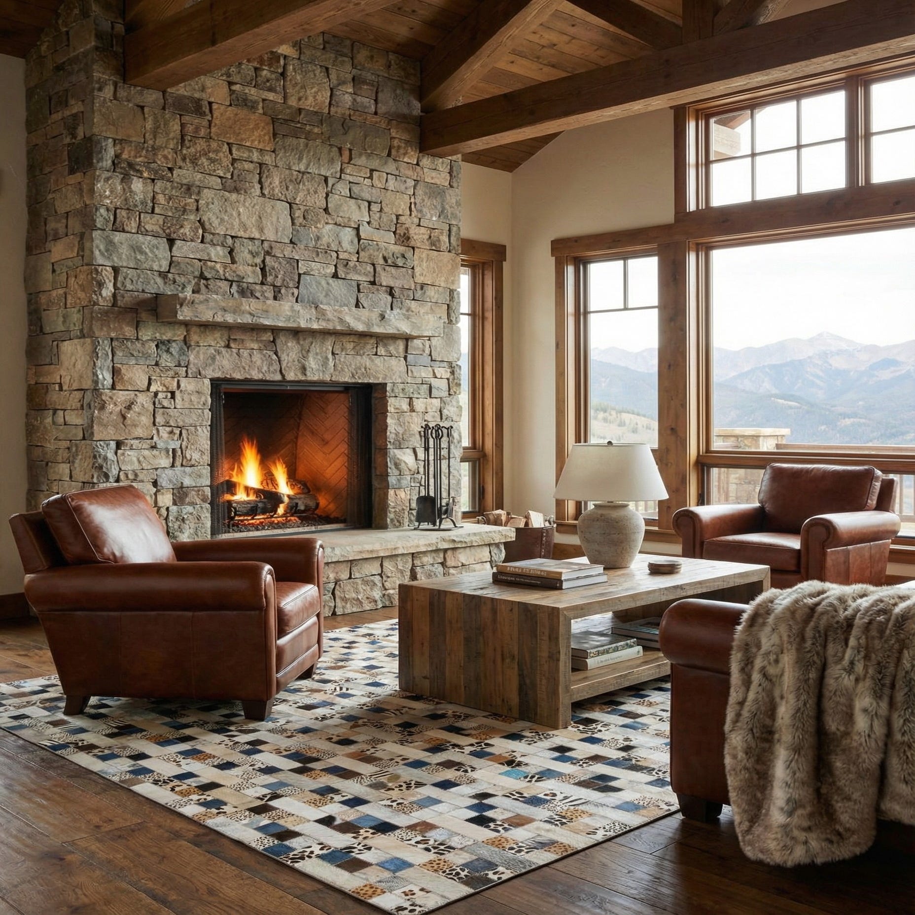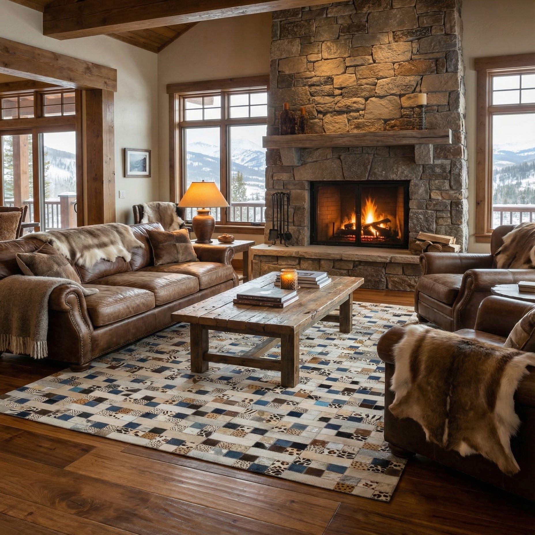 Each square is unique, showcasing different natural prints and shades, which means no two rugs are exactly the same. The overall effect is one of organic sophistication, suited to a variety of interior styles from rustic to contemporary. The tactile quality of the cowhide and leather lends a luxurious feel to the rug, while its sturdy construction ensures durability.